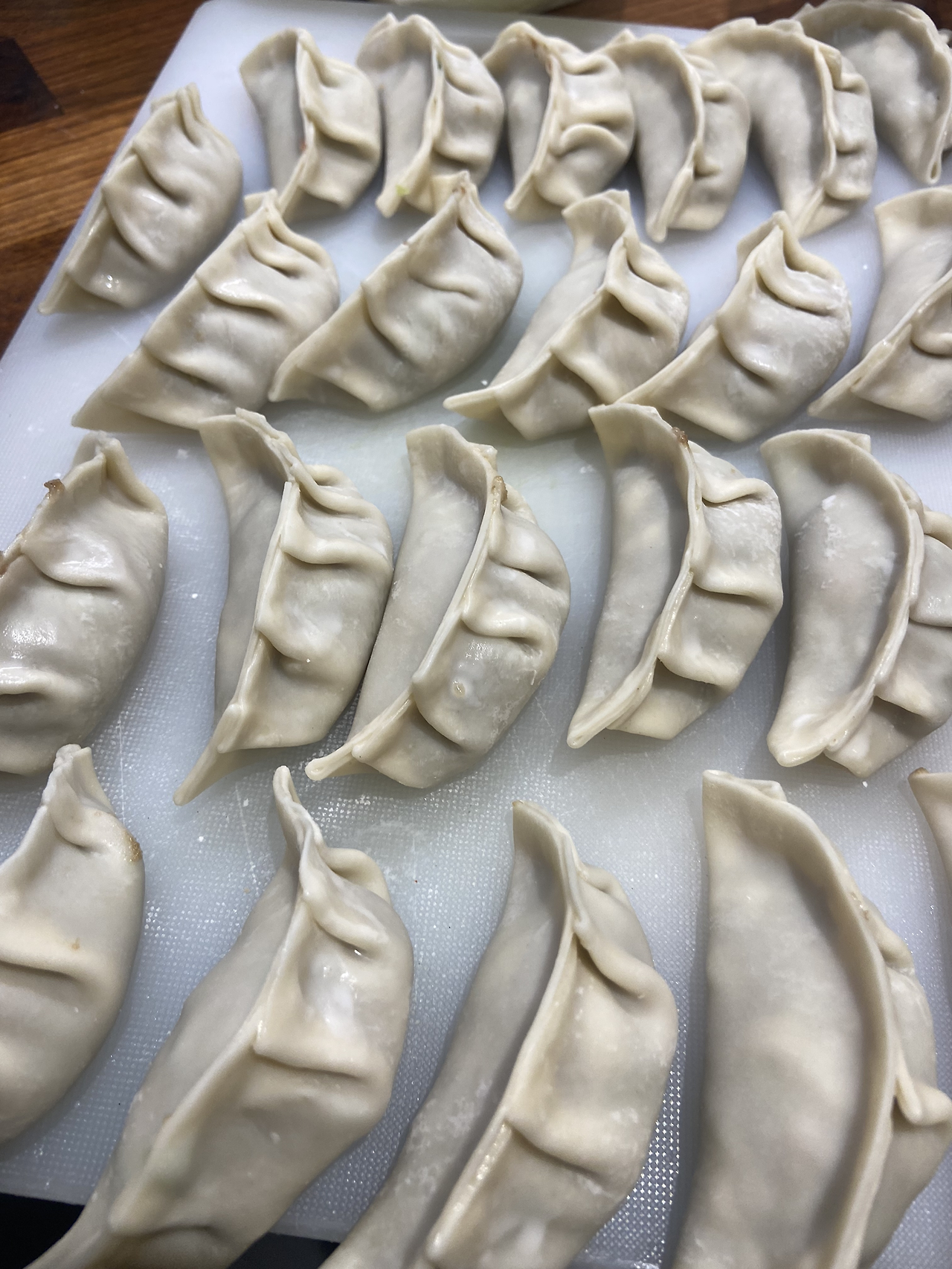 이제 만두를 빚는다. 만두피를 하나 떼어내어 만두소를 넣고 물을 테두리에 묻히고, 예쁘게 빚어낸다. 계속 반복한다. 40개 정도 빚은 것 같다. 보관을 위해 모두 쪄내야 한다. 찜기에 김이 오르면 만두를 넣어 15분간 쪄낸다. 일부는 바로 군만두를 만들어 보았다. 찐만두와 군만두로 이날 저녁을 해치웠다. 찐만두보다 군만두가 너무 맛있었다. 냉동해 둔 나머지 만두들도 군만두를 해야겠다 생각했다. 남은 만두들은 한 김 식힌 후 통에 담아 냉동한다.