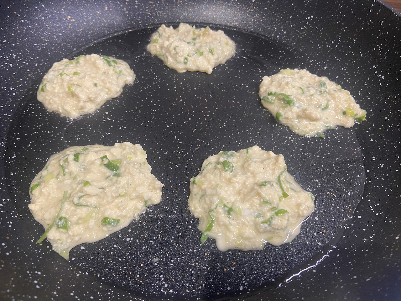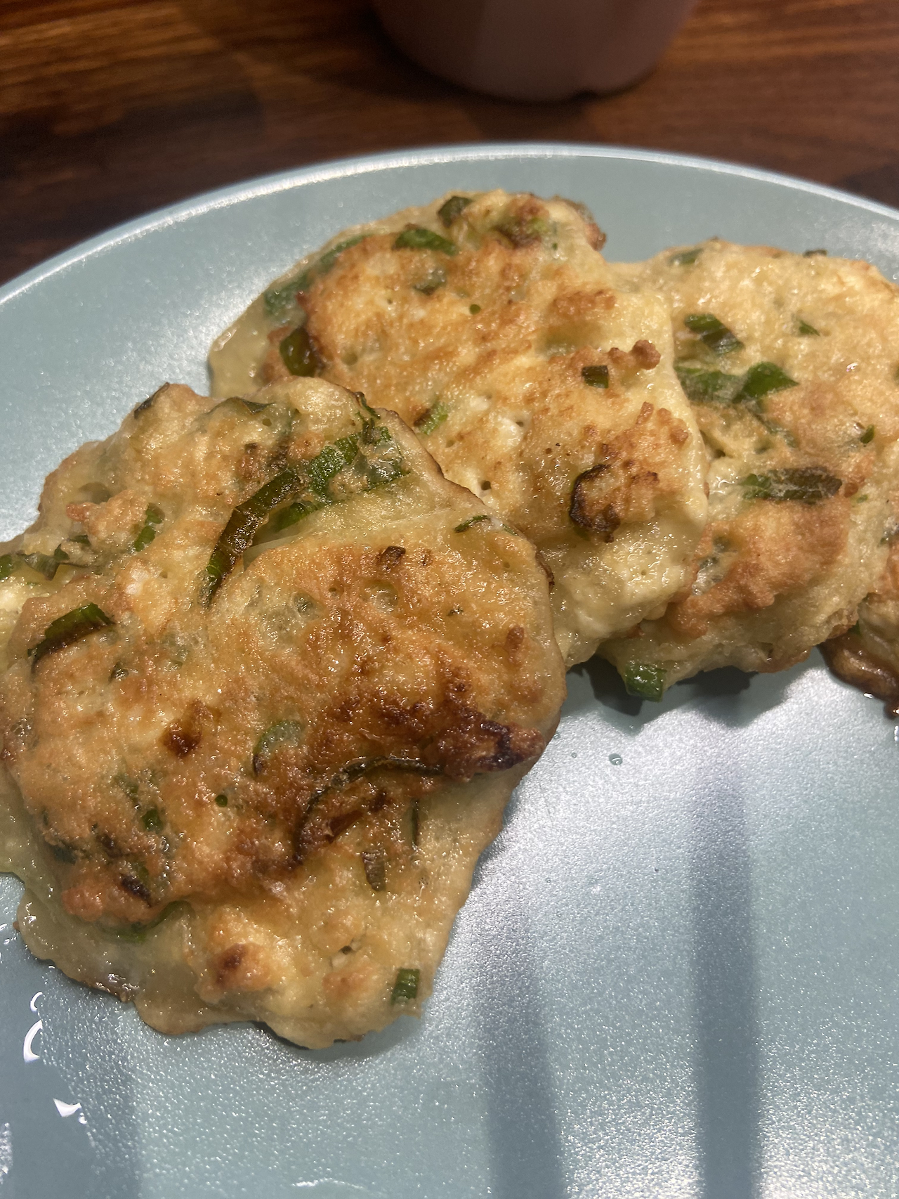 마지막으로는 두부를 으깨서 수분을 좀 제거해 주고는 파를 썰어 넣고, 전분으로 수분감을 잡아주었다. 간장, 참기름으로 간을 하고는 반죽을 기름 둘러준 팬 위에서 바삭하게 구워주었다. 바삭한 상태로 먹을 때는 간이며 다 좋았다.