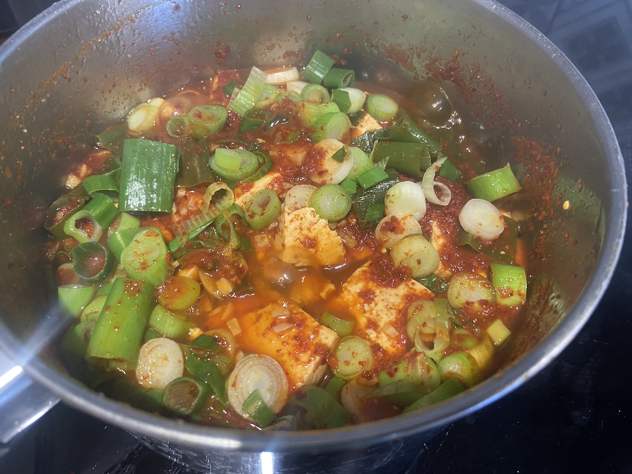 먼저 된장찌개를 끓였다. 물론 된장찌개에 고기를 넣으면 더 맛있기는 하다. 하지만 두부로 식물성 단백질만의 맛을 보여줘야 하기 때문에 이번 두부요리들은 비건으로 준비하기로 했다. 양파와 호박을 잘라 넣고, 된장을 풀어 넣는다. 고추장도 살짝 넣어 매콤함을 추가하고 고춧가루도 좀 넣어 진하게 끓여낸다. 이 친구가 일본의 미소된장국에는 익숙해서, 그와 다른 진한 한국의 된장찌개를 맛 보여주고 싶었기 때문이다.