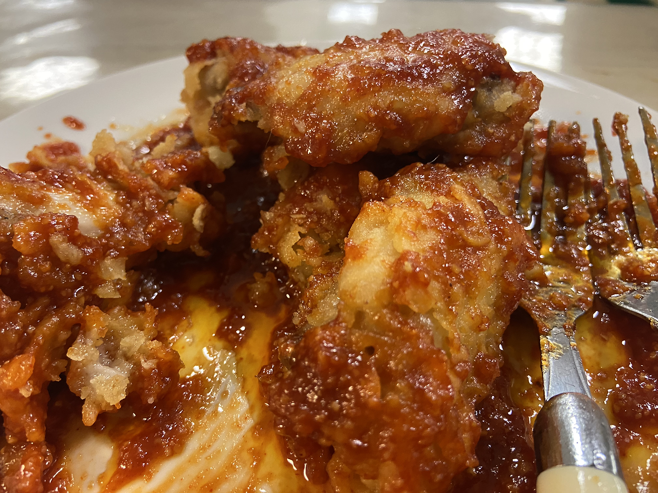 그렇게 닭가슴살 10덩어리를 30유로나 주고 사서는 아뜰리에 전, 먹기 좋은 크기로 잘라서 미리 초벌 튀김을 하였다. 거의 한 시간이 넘도록 계속 튀겼던 것 같다. 그렇게 튀겨서는 냉동보관을 했다. 그 후, 아뜰리에 전날 마트에서 닭날개를 샀다. 여기는 윙과 봉이 분리되어 팔지 않아서, 24개의 날개를 모두 윙과 봉으로 직접 해체해야 했다. 그렇게 준비하고는, 당일에 소스는 1인분을 만들 것이기에 전날 미리 어느 정도 소스도 만들어 두었다. 레시피를 작성하기 위해, 진작에 미리 내가 맛을 보며 양념치킨 양념 조합비율을 잘 정리해 뒀었다. 내 입맛에 맞춘 레시피지만 모두가 좋아해 줄 거라 믿었다.