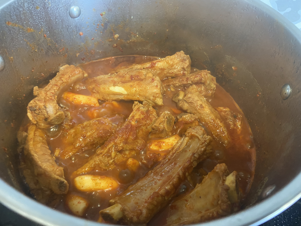 한국 조리법에서 등갈비 같은 뼈 있는 고기를 찬물에 오래 담가 핏물을 빼거나 하는데, 그 방법을 그다지 좋아하지 않는다. 귀찮고, 꼭 필요한 것처럼 느껴지지 않는다. 재빠르게 초벌 삶기로 불순물들을 제거하기로 한다. 별다른 재료를 넣지는 않는다. 등갈비를 하나하나 잘라준다. 냄비에 등갈비를 모두 넣어주고 가지고 있는 허브들과 후추를 넣고 물을 부은 후 5분가량 끓여준다. 그런 후, 찬물에 깨끗하게 모두 하나하나 씻어내 준다. 그런 후 깨끗하게 씻어 준 냄비에 다시 등갈비를 넣고 등갈비가 잠길 만큼 물을 붓고는 40분 끓여주었다. 그동안 딴짓을 한다. 알람이 울리면 등갈비를 확인하러 가본다. 잘 익었다. 이제 양념을 한다. 양념은 크게 특별할 것은 없다. 간장, 설탕, 고춧가루, 고추장, 굴소스, 다진 마늘 (듬뿍) 넣어준다. 오늘 맛의 하이라이트를 위해 조미료도 한 꼬집 넣어준다. 그런 후, 30분 더 끓여준다. 막판에 냉장고에 남아있던 떡볶이떡을 좀 더 넣어준다. 떡볶이떡을 넣고 저어주는데 등갈비의 뼈에서 고기가 사르르 분리된다. 부드럽게 잘 익었다는 신호다. 충분히 끓여준 소스 간을 본다. 음... 오늘 좀 잘된 것 같다.