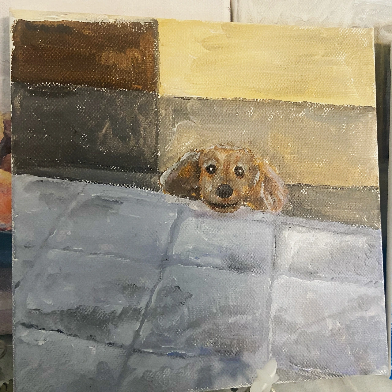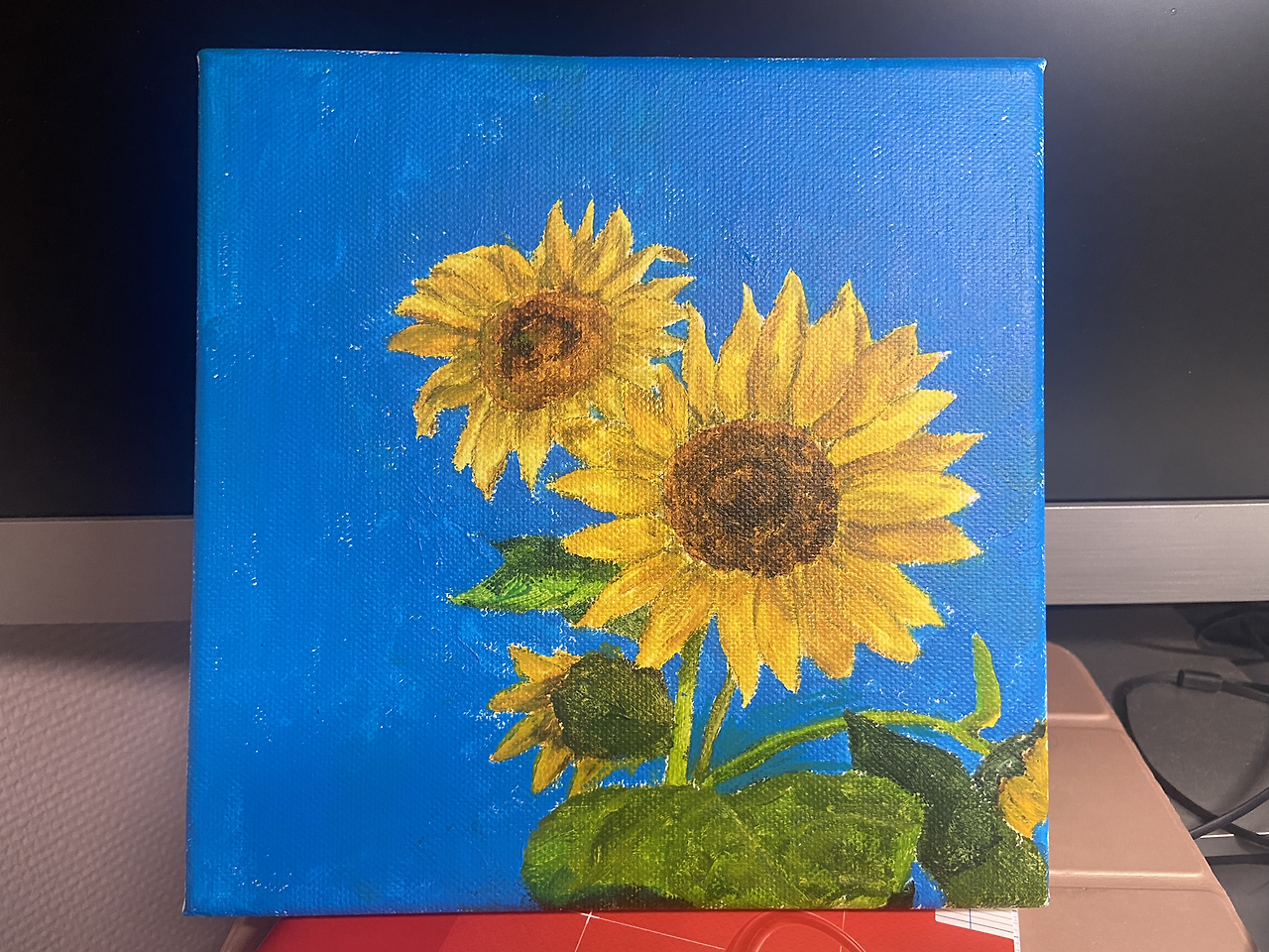 구글로 해바라기 사진을 검색한다. 그중에 맘에 드는 사진을 하나 골라서 작은 캔버스 (20x20cm)에 연필로 간단하게 스케치를 한다. 그런 후, 아크릴로 색칠을 시작한다. 처음에 사진을 보며 색칠을 하려 했으나 하면 할수록 사진처럼 전혀 되지 않았다. 그래서 사진을 더 이상 보지 않고, 그냥 내 맘대로 색을 칠하기 시작했다. 어차피 똑같이 그릴 수가 없는데 사진이 무슨 필요겠는가. 그렇게 맘대로 계속해서 덧칠해 가며 그려낸다. 마지막으로 바탕을 쨍한 파란색으로 채워 넣는다. 음... 처음치고 나쁘지 않은 것 같다. 그렇게 그린 것을 사진 찍어 지인에게 보내본다. 맘에 드는가 보다. 생각보다 잘 그려지니 기분이 좋고 재밌었다.