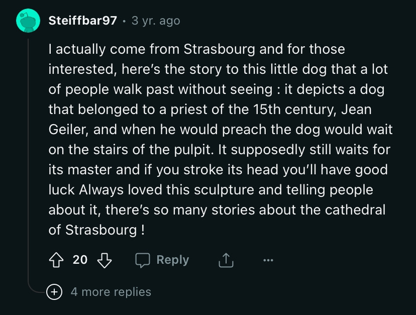 점심을 해결하고는 함께 밖으로 나온다. 나와 친구 둘다 스트라스부르에 살지만 이곳에 대해 아는게 얼마 없어서 볼만한 곳이라고 아는게 대성당뿐이다. 함께 대성단으로 걸어간다. 1년 6개월 남짓 이 도시에 살면서 대성당을 밖에서 지나친게 대부분이고 성당 내부에 간 적은 많지 않다. 함께 성당에 들어가 성당을 둘러본다. 가이드를 하는 분들이라 건축같은 것에 대해서도 공부한게 많아서인지 성당의 장미창과 같은 것들에 대해 알려준다. 설명을 들으며 고개를 끄덕인다. 이 곳에 살고있름에도 관광을 시켜주는게 아니라 내가 관광을 받는 것 같다. 그러면서 두분이 갑자기 개 조각상을 찾아야한다는 거다. 그 개를 만지면 영생과 굿럭을 의미한다면서 둘에 열심히 개 조각상을 찾는 거였다. 한번도 들어보지 못한 개 조각상이라 대체 어디있는건가 하면 함께 찾았다.(사실 난 별 관심이 없었다) 그러다 한명이 찾았다해서 가보니 정말 손가락 두 뼘만한 크기의 작은 개 조각이 있었다. 이 큰 대성당에서 이 작은 조각을 찾아내다니 집념이 대단하구나 싶었다. 사람들이 많이들 만졌는지 조금 맨질거린다. 열심히 찾아서 안만지면 아쉬우니 나도 한번 슬쩍 손을 올려본다.