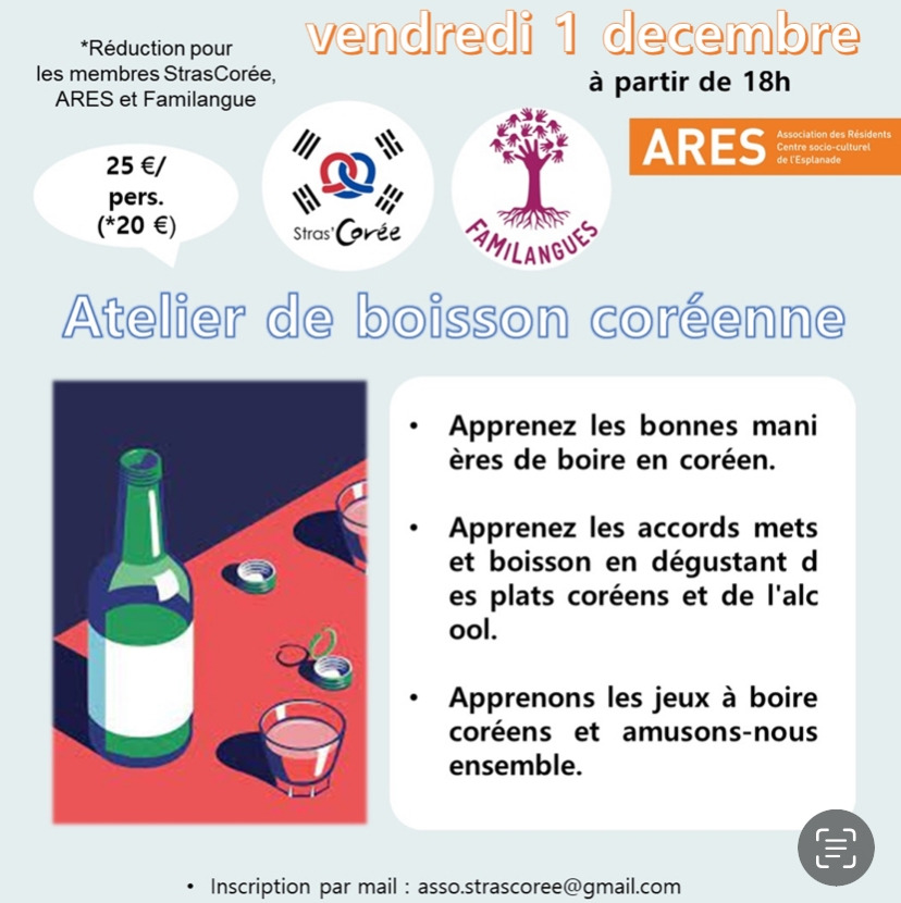 12월에 하려던 메뉴들을 이것저것 고민하다가, 12월이나 약간 파티처럼 놀 수 있는 시간을 만들고 싶었고 그래서 생각해 낸 것이 « 술판 »이었다. 한국 안주들을 준비해 두고, 막걸리, 맥주, 소주에 어울리는 안주들을 소개하고 함께 맛보며 한국 술게임을 알려주는 거다. 그렇게 계획을 짜고는 다른 때보다 더 열심히 홍보를 했던 것 같다. 다른 아뜰리에를 할 때나 사람들을 만날 때마다 홍보를 했다. 그렇게 열명정도 되는 사람들이 신청을 했다. 술 게임을 하며 텐션을 높이기 위해 도와줄 한국인들도 불러 모았다. 한국인도 7명 가까이 참여해서 제법 인원이 되는 자리가 만들어졌다.