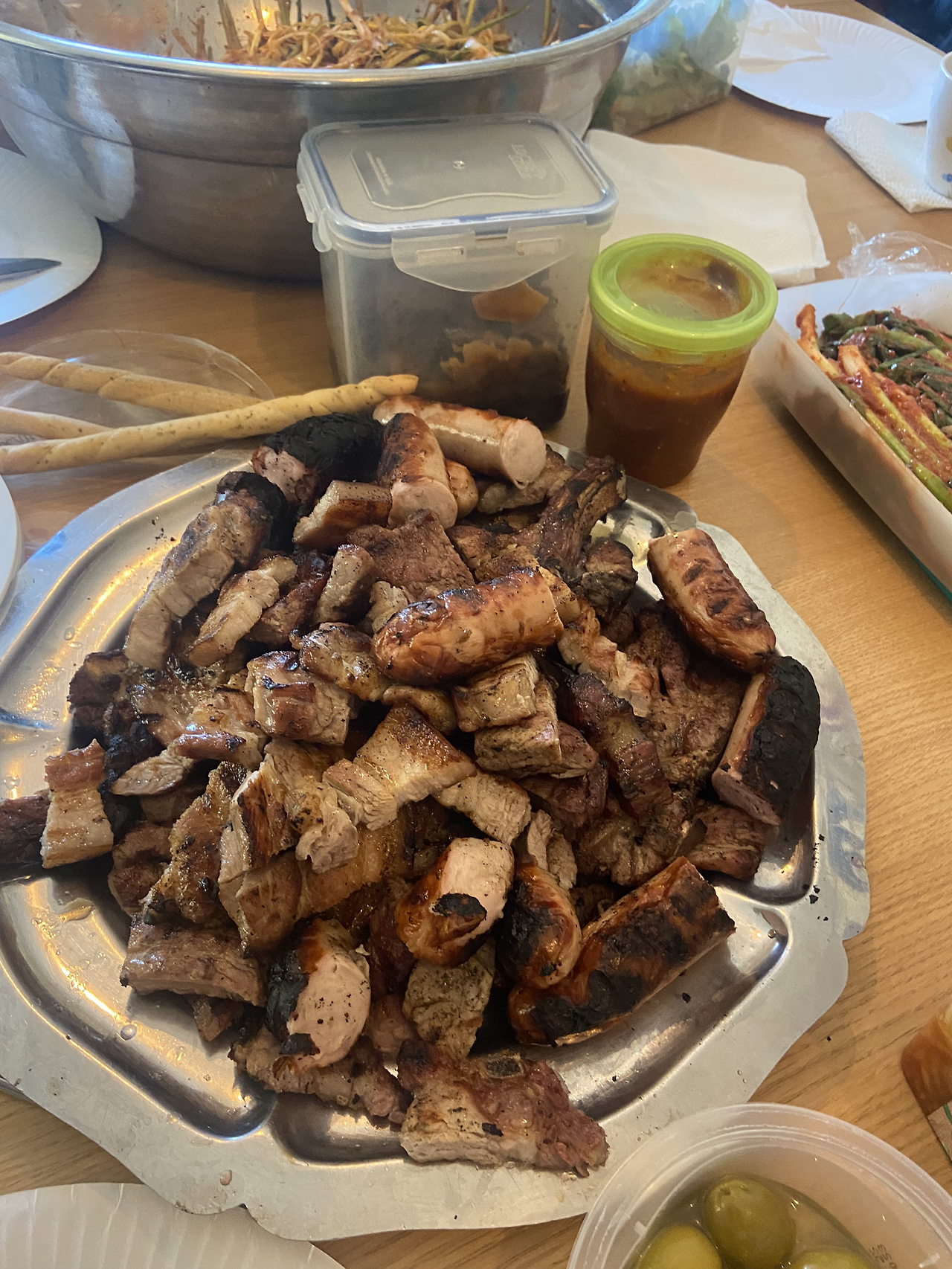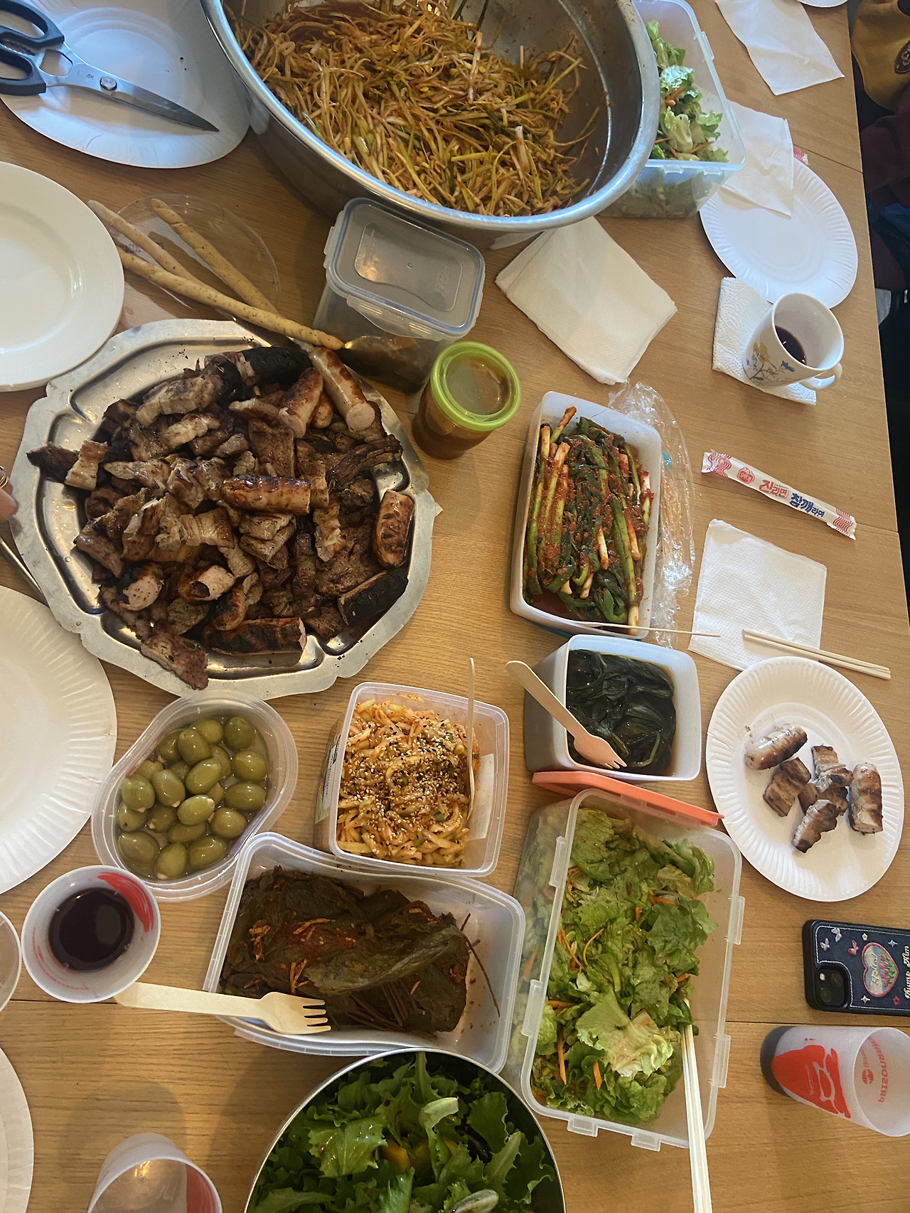 미사가 끝난 후, 한인 커뮤니티 사람들이 모여 바비큐를 하기로 했다. 각자 먹을 고기와 반찬이나 곁들일 메뉴들을 챙겨 오기로 했다. 나는 LA갈비를 재워 가져갔는데, 막상 가보니 사람들이 너무 한가득 가져와서 내가 가져온 게 소박하게 느껴졌다. 조금 민망할 정도였다. 거의 한국에서 먹는 것과 다름없는 반찬들이었다. 깻잎장아찌, 파절이, 명이나물, 파김치, 삼겹살 (잔뜩), 소시지, 매콤양념닭다리 등 먹을 게 넘쳐났다.