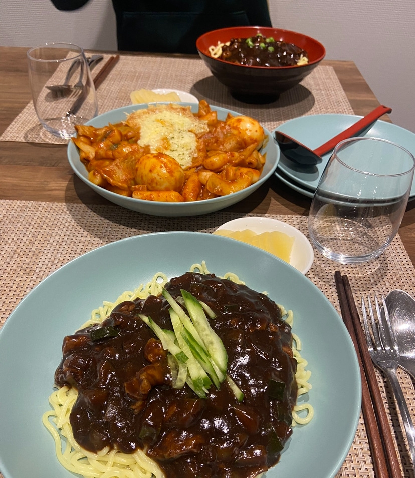 그녀의 요청메뉴 자체가 워낙 금방 만들 수 있는 거라, 평소대로 출근을 하고 일하고 퇴근을 했다. 집에 돌아오니 6시가량 되었다. 약속 시간은 7시였다. 먼저 떡볶이를 한다. 이제는 정착한 레시피가 있어서 머릿속 레시피대로 양념을 만들어 떡볶이를 만든다. 그다음은 짜장면을 만들 차례이다. 돼지고기를 자르고, 호박과 양파도 준비해서 볶고 춘장과 각종 양념들을 넣고 전분물을 풀어 짜장 소스를 완성한다. 그녀에게 미리 짜장면의 고명으로 오이 or 완두콩을 물어본 상태였다. 이제 우리 집에 도착하면 면을 삶아 짜장면을 얹어주면 끝이다. 너무 빨리 요리를 마치고 언제 오나 그저 기다렸다. 조금은 늦게 우리 집에 도착한 그녀를 간단히 집 소개를 해주고는 식탁이 있는 거실로 안내한다. 그런 후, 면을 삶고 요리를 준비하여 선보인다. 한국인이니 그냥 한 번에 차려낸다. (우리는 코스 문화가 아니니까. )