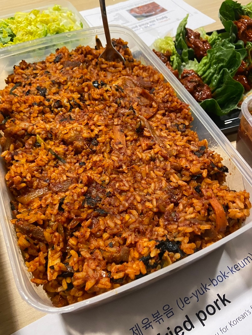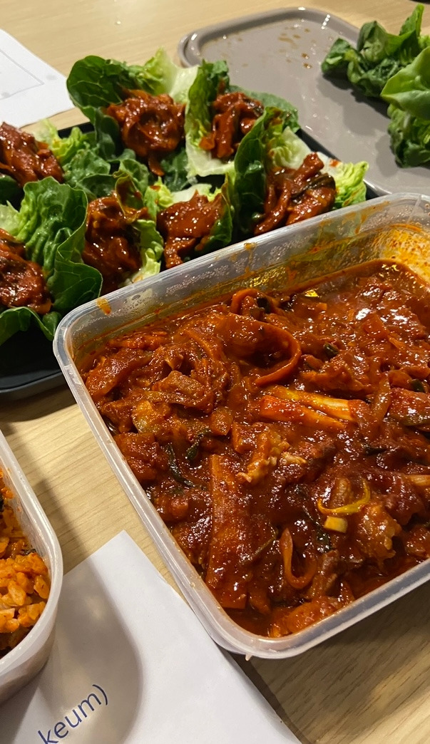 음식을 꺼내 세팅을 한다. 처음에는 맵지 않은 요리로 찜닭, 그 후에는 비건용 잡채, 그다음 김치볶음밥, 마지막이 가장 매운 제육볶음이었다. 사람들이 접시를 들고 줄을 섰다. 앞에 내가 미리 준비해서 만들어 온 요리에 대한 설명서를 붙였지만, 다들 안 보고 이게 뭐냐고 물어서 모두 설명해줘야 했다. 사람들에게 요리를 나눠주며, 내가 간과했던 사실이 있다는 것을 알았다. 이곳은 다양한 종교의 사람들이 있고, 돼지고기를 선호하지 않는 사람들이 꽤 있다는 것이다. 더 맛있게 한다고 김치볶음밥에도 돼지인 베이컨을 넣어 못 먹는 사람이 있었고, 마지막 고기도 돼지고기라 못 먹는 사람들이 있었다. 치킨은 할랄이냐고 묻기도 하더라. 한국에서는 이런 다양성을 고려할 필요가 없었기에 내가 미처 생각하지 못했던 거다. 잠시 자기반성을 했다. 사람들이 요리를 떠가서 먹고, 두세 번 다시 와서 더 떠가는 사람들이 있었다. 내게 다가와 이 걸 혼자 다 한 거냐며 (동료가 도와줘서 힘들지 않았다고 말한다.) 대단하다고 말한다. 한국 음식을 좋아한다고 말하는 사람들도 있었고, 자기가 아는 한국에 대해서 뭐라도 말하는 사람들이 있었다. 고맙게도 같은 연구실 사람들도 몇 명 와주었다. 음식을 먹고는 맛있다며 다음에 레시피를 알려달라는 친구들도 있었다. 행사장의 배경음악은 내가 만들어 온 K-POP 최신 플레이리스트였다.