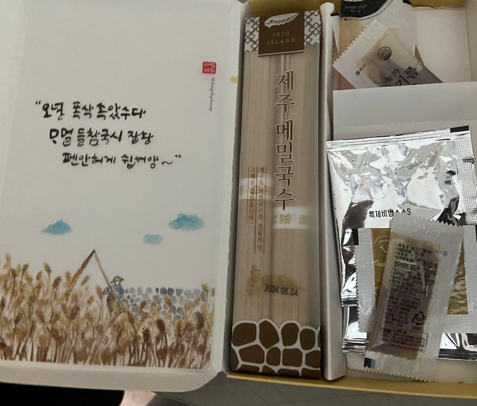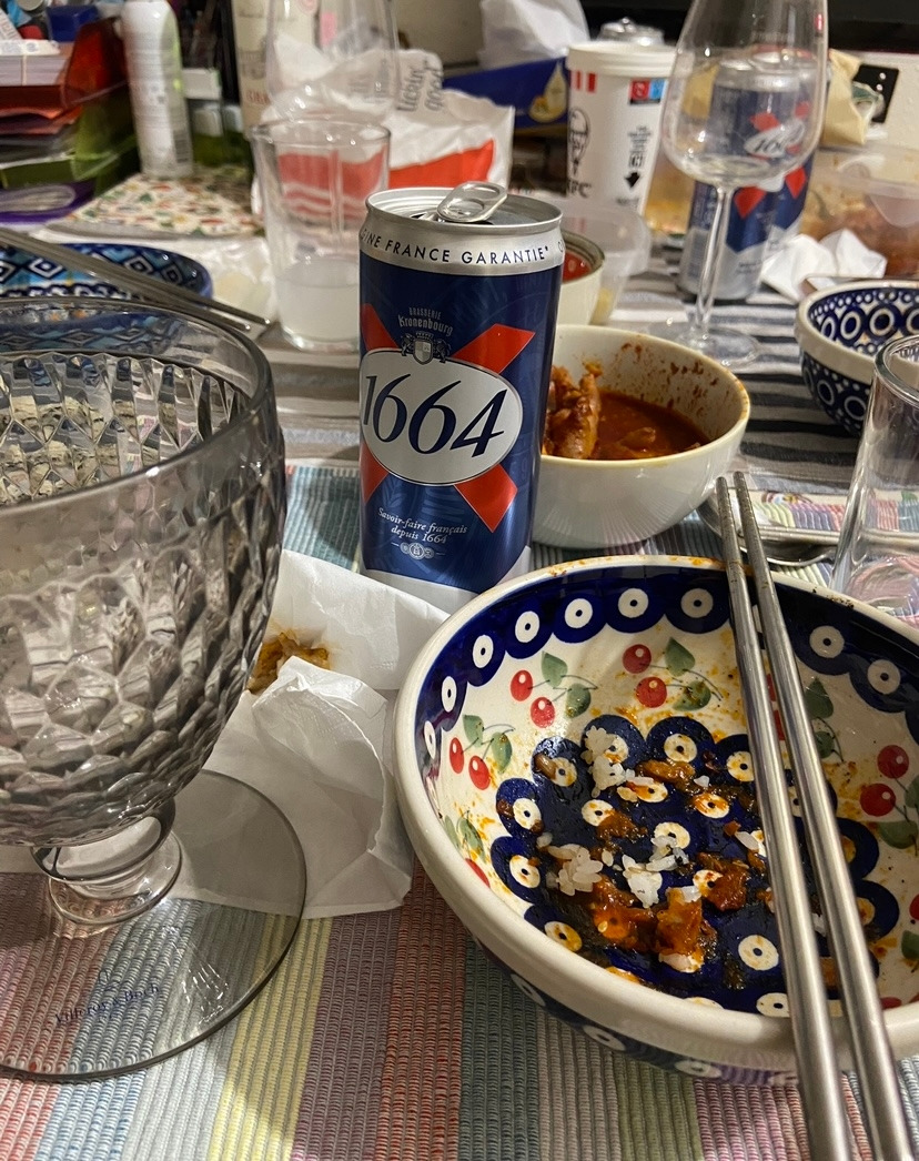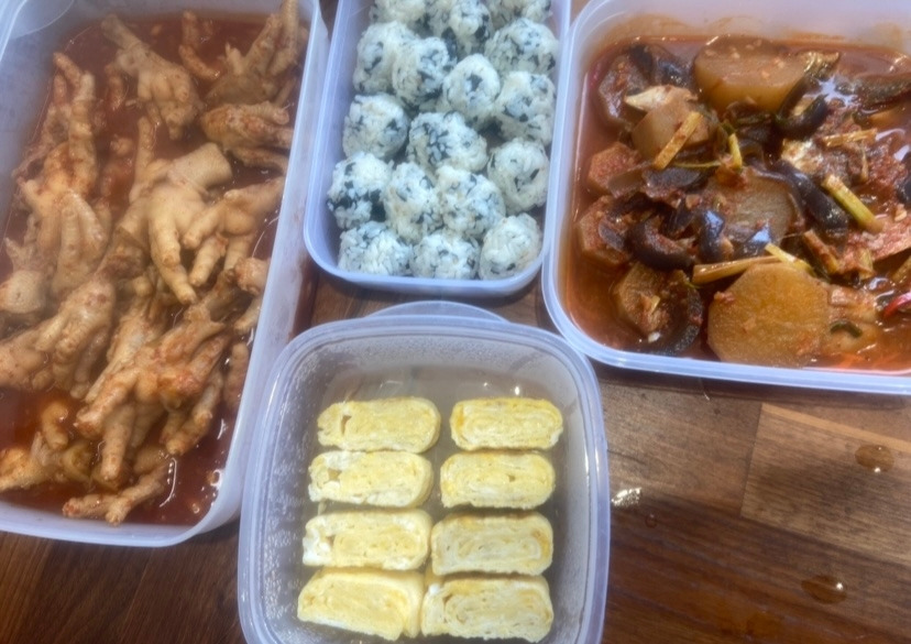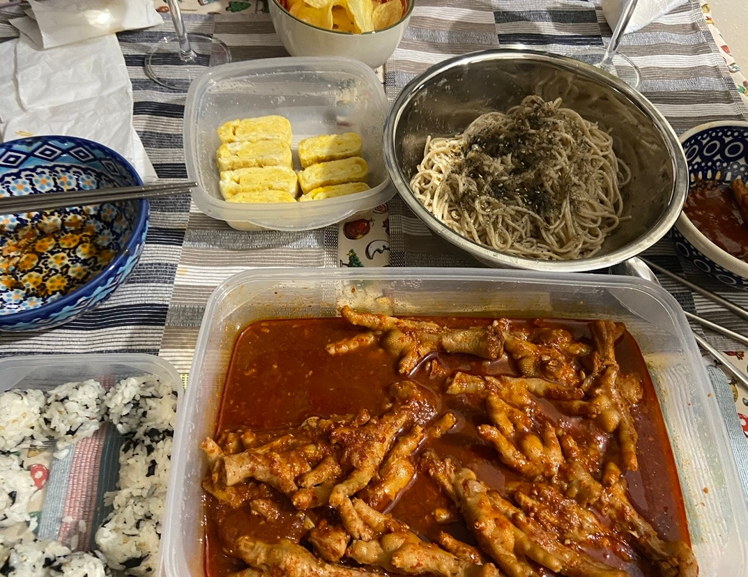 닭발만은 아쉬워 주먹밥, 계란말이, 그리고 남아있던 생선조림까지 챙겨서 시내에 있는 지인 집으로 향한다. 시내 중심가에 있어서 만날 일이 있으면 이 친구의 집에서 자주 모이게 되는 것 같다. 가보니 테이블에 술 잔과 함께 미리 세팅을 끝내뒀더라. 닭발을 데워온다. 그러면서 들참국수를 먹어봤냐고 하더라. 뭔가 했더니 들기름+참기름 국수라고 밀키트가 있다고 했다. 아껴둔거라면서 그 국수를 만들어왔다. 면만 익혀서 동봉된 소스들을 넣고 비벼주면 완성이었다. 들기름, 참기름 서로 다른 두 고소함이 함께 나는 것이 향부터 너무 매력적이었다. 먼저 닭발을 먹다가 매콤함이 올라올 때, 주먹밥, 계란말이 또는 들참국수를 먹어줬다. 다들 닭발을 능숙하게 아주 잘 먹더라. 파는 것 같다며 내게 계속해서 칭찬을 해줘서 조금 민망했다. 한 분은 생선조림을 안 좋아해서 안 먹었지만, 다른 분은 생선조림을 맛보고도 너무 맛있다며 무 조림도 계속해서 먹었다. 이런 저런 대화를 하고, 술도 마시고 맛있는 모임이었다.