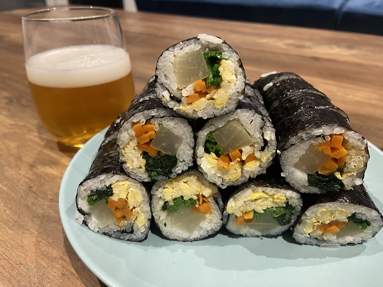 다시 제대로 집밥으로 먹어야겠다는 생각에 퇴근 후, 아시아마켓에 간다. 잠시 둘러보다가 단무지가 눈에 띈다. 그러고 보니 한동안 김밥을 안 먹었다. 김밥이 먹고 싶다. 냉장고에 소고기다짐육이 있었던 게 생각나서, 그걸 그대로 쓸 생각으로 간단하게 계란, 당근, 시금치, 단무지를 사 온다. 계산대로 가다가 주류코너를 지나친다. 맥주가 보인다. 요즘 한동안 맥주를 안 마셨기에 맥주 한 캔도 챙겨든다.