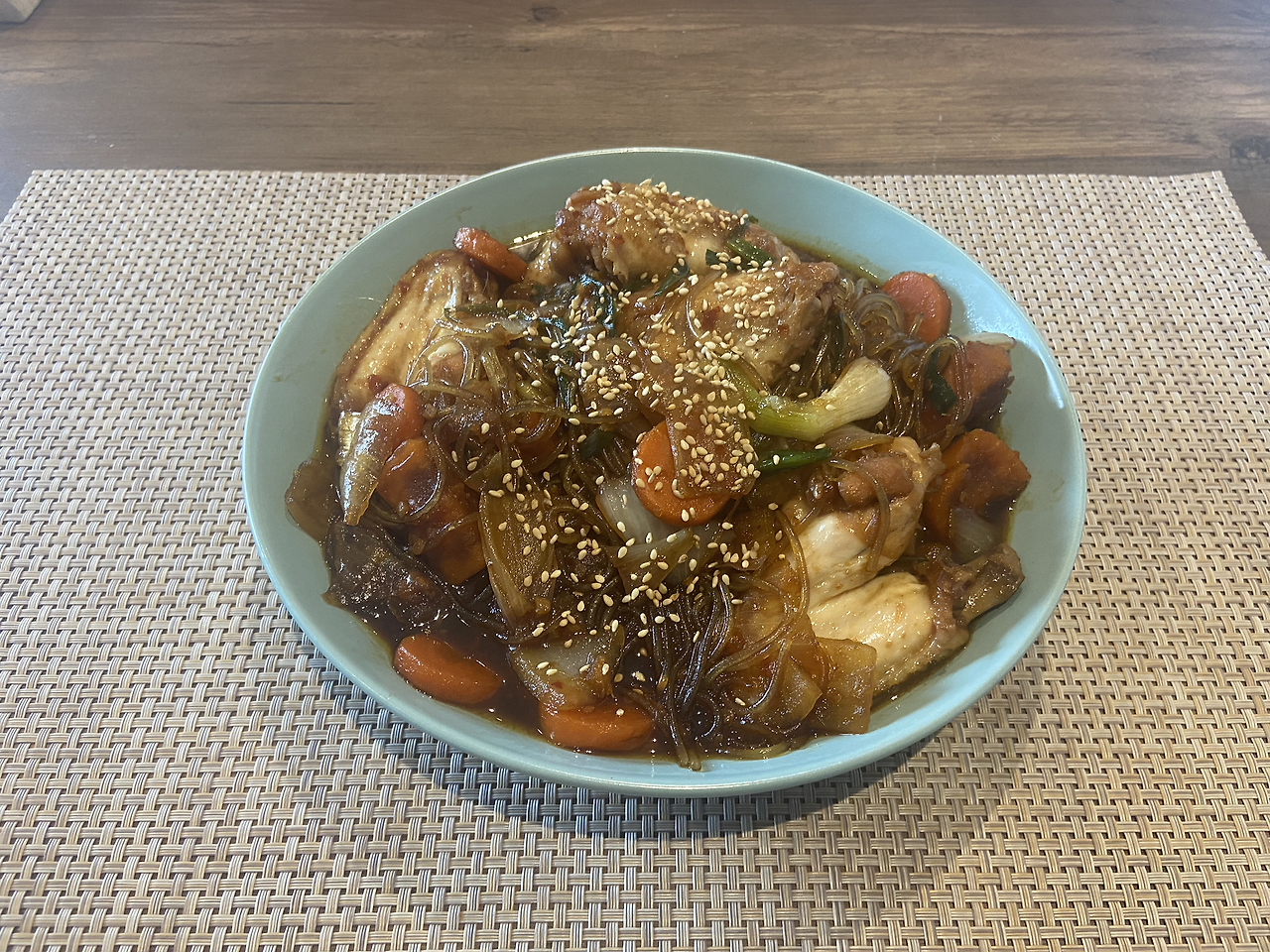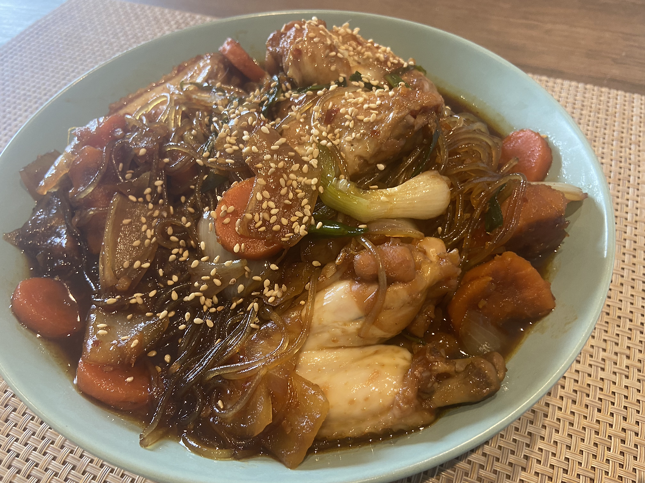 익는데 시간이 좀 걸리는 감자를 큼직하게 잘라 넣자. 닭에 색이 좀 물들기 시작하면 당근과 양파도 넣어준다. 이때쯤 당면을 물에 불려줘야 한다. 그냥 마른 당면을 넣으면 수분을 너무 빨아먹어서 국물 없는 찜닭이 되어버린다. 닭도 다 익었을 때는 국물의 간을 볼 수 있다. 이미 넣어줬던 간장으로 닭에 간이 어느 정도 배어들었겠지만 국물이 혹시 조금 싱겁다면 간장을 이때 조금 더 넣어준다. 간이 잘되었다면 이제 당면을 넣어준다. 조심하라. 당면 양이 너무 많으면 국물이 모두 사라져 버릴 거다. 당면을 좋아한다면 애초에 국물을 좀 넉넉히 준비하는 것도 방법일 것이다. 너무 욕심부리지 않고 적당히 당면을 넣고 같이 끓여준다. 마지막으로 참기름을 살짝 둘러 고루 섞어준다. 당면 가득, 내가 좋아하는 부위로만 준비한 찜닭 완성이다.
