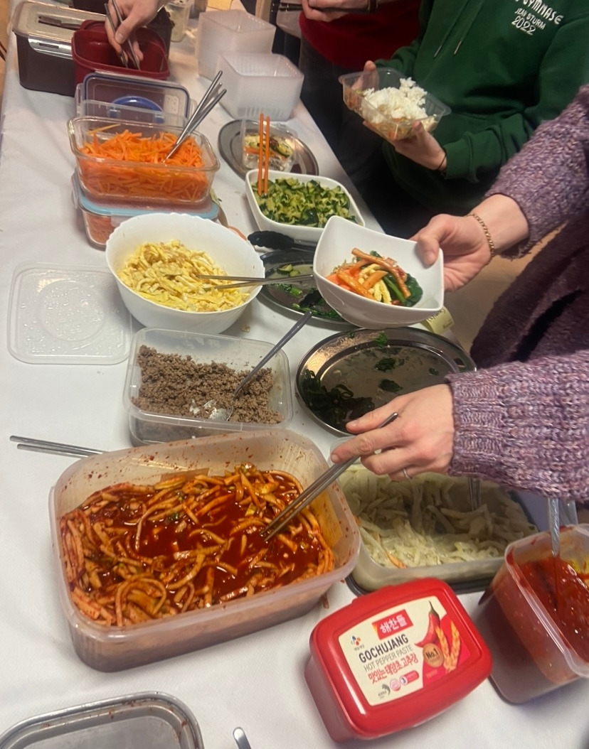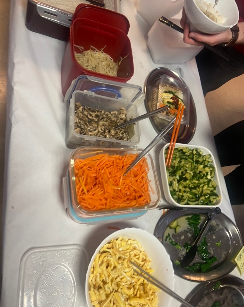 설날이 되었다. 내가 가져갈 것은 양념고추장, 간장소스, 무생채, 소고기뭇국, 무나물 정도였다. 설날 행사를 하는 강당에 가서 먼저 테이블들을 세팅하고, 선생님들이 도착하는 대로 음식 재료들을 꺼내두면, 한쪽에 비빔밥을 위한 세팅을- 다른 한쪽에는 전을 위한 세팅을 했다. 비빔밥 재료는 다양하게 준비되었다. 먼저 시금치나물, 버섯나물, 소고기볶음, 당근볶음, 무나물, 계란지단, 호박나물, 숙주나물, 무생채가 있다. 그리고 선생님들이 나눠서 준비해 온 밥들이 있어서 밥도 한 곳에 모아두었다. 그릇 하나에 비빔밥 하나를 세팅하여 이렇게 챙겨가서 먹으라고 안내가 되도록 준비했다. 어느 정도 세팅이 끝나기 전에 나는 먼저 자리를 잠시 떠야 했다. 행사 시작을 알리는 사물놀이 공연에 참여하기 때문이었다.