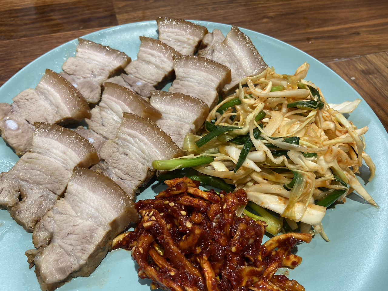 1인분만 만들기엔 적절치 않은 요리들이 있기 마련이기에 혼자 살면 요리가 종종 남기도 한다. 나에게 그런 요리 중 하나가 수육이다. 수육을 만드는 데 시간도 걸리니 작은 한 덩이만 요리하기는 뭔가 아까운 기분이다. 그렇다고 넉넉히 만들면, 만드는 순간에는 만족스럽지만 결국 언제나 남곤 한다. 그렇다고 내 수육이 맛없는 건 아니다. 분명 촉촉하고 맛있다. 다만 양이 조금 많을 뿐이다. 난 수육은 간단하게 된장 수육으로 만드는 편이다. 만드는 법은 내가 하는 모든 요리가 그렇듯 간단하다. 냄비에 통삼겹을 넣고, 양파를 큼직하게 썰어 넣고, 파도 크게 썰어 넣는다. (나는 쪽파뿐이지만) 통마늘도 넉넉히 넣어주고, 된장을 크게 한 스푼 넣는다. 통후추가 있다면 통후추를 넣고 나는 없어서 후추 그라인더로 넉넉히 갈아 넣어준다. 그렇게 한 번 팔팔 끓게 한 후, 중불로 낮춰서 40분~1시간 삶아주면 끝이다. 핸드폰으로 알람만 맞춰두고 고기가 익는 동안 딴짓을 하면 된다. 불안하다면 15분마다 알람을 맞춰 한 번씩 살펴봐주면 된다. 15분 사이에 뭐가 크게 잘못될 것은 없으니까 말이다.