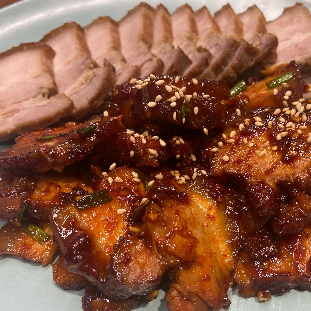 이렇게 한 끼를 먹고 나서 수육이 남으면 또 먹기는 싫다. 아무리 맛있어도 나는 연속으로 두 끼 같은 메뉴는 잘 먹지 못한다. 양이 적은 게 아니라 한 가지를 계속 못 먹어서 입이 짧은 편이라 할 수 있다. 그럴 때 생각해낸 것이 불족발이었다. 양념된 물에서 익혀낸 족발을 잘라 양념에 다시 익혀내지 않는가. 그런 느낌을 원했다. 양념은 평소 하던 빨간 양념으로 준비해보았다. 고춧가루, 고추장, 간장, 설탕, 다진 마늘 적당한 비율로 내 취향대로 섞어준다. 먼저 남은 수육을 냄비에서 건져내서 고기를 잘라준다. 그런 후 팬에 기름을 두르고 고기를 볶듯이 하다가 양념을 넣어준다. 매운맛을 원한다면 청양고추를 넣어줘도 되겠지만, 난 맵 찔이라 고춧가루로 충분하다. 양념에 볶아주다가 하나 건져내서 먹어본다. 앗! 맛있다. 양념족발 같은 느낌이다. 내가 만들었지만 맛있다. 수육으로 이미 된장이 간이 되어 있는 상태에서, 겉에 양념이 매콤 달달하게 좋다. 불족발이 아닌 불삼겹이다. (비록 불맛이 나진 않지만, 매운맛은 있으니 불이라고 하자.) 수육을 먹거나 시켜먹은 보쌈이 남았다면 한 번 양념을 해서 요리해보자. 남은 요리의 변신도 부담 없는 1인 식탁의 즐거움이다.