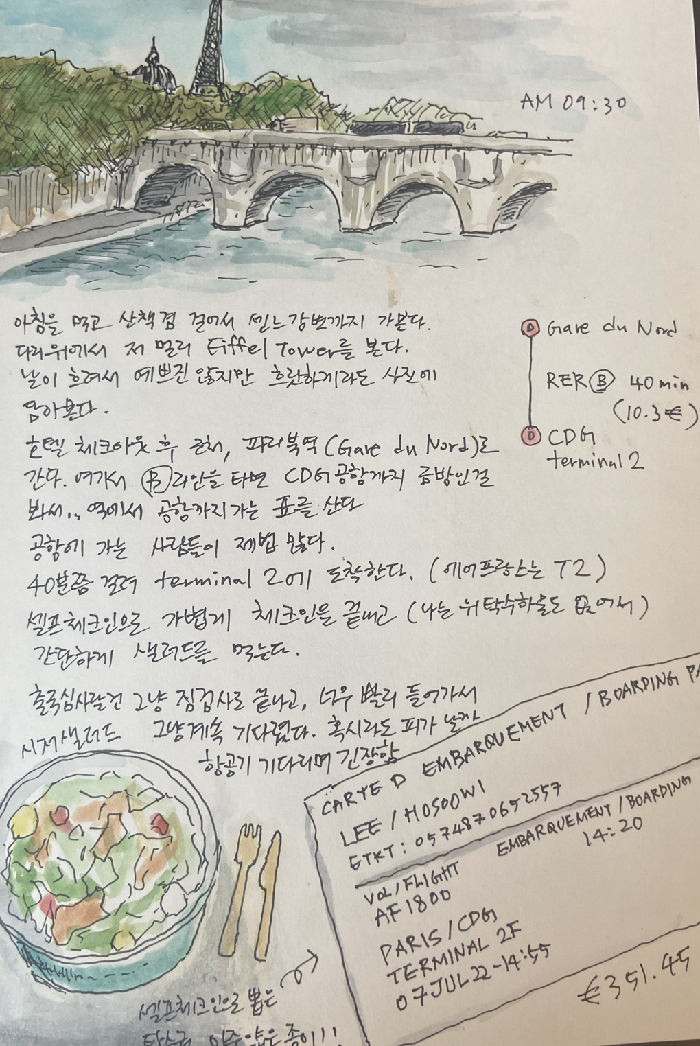 호텔 체크아웃 후, 근처 파리북역 (Gare du Nord)로 간다. 여기서 B라인을 타면 샤를드골공항까지 바로 간다. 공항에 가는 사람들이 제법 많았다. 40분쯤 걸려 터미널 2에 도착한다. 셀프체크인으로 가볍게 체크인을 끝내고 (나는 위탁수하물도 없었다.) 간단하게 샐러드를 먹는다. 간단하게 짐검사하며 출국심사를 마치고, 너무 빨리 도착해서 그냥 계속 기다렸다.
