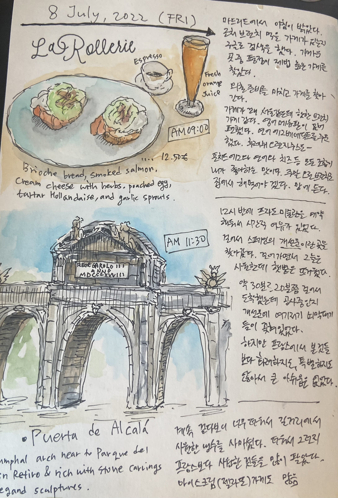 마드리드에서 맞이하는 첫 아침이었다. 근처에 괜찮은 브런치 가게가 있는지 구글로 검색을 했다. 가까운 곳 중에 평점이 가장 높은 곳을 찾아갔다. 가게가 꽤 서울 같은 느낌이었다. 핫한 브런치 가게인가 싶었다. 영어 메뉴판이 있어서 편했다. 연어 에그베네딕트와 플래시 오렌지 주스를 주문했다. 물론 커피도- 포치드에그와 연어, 치즈 등의 모든 조합이 내가 좋아하는 맛이었다. 주말 오전 브런치로 집에서도 해 먹어 봐야겠다 생각했다. 맘에 든다.