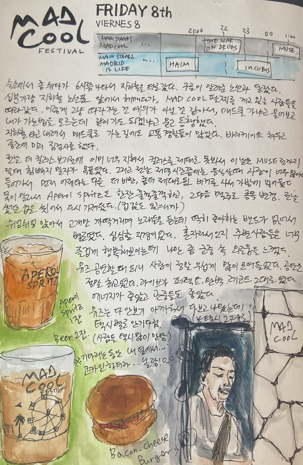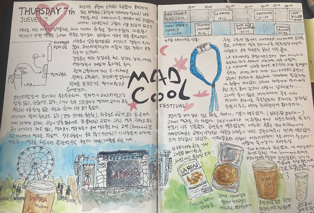 숙소에서 좀 쉬다가 6시쯤 나와 지하철을 타러 갔다. 구글이 알려준 노선과 달랐다. 십분 가량 지하철 노선표 앞에서 한참을 헤매다가 MAD COOL 팔찌를 끼고 있는 사람들을 일단 따라갔다. 이렇게 그냥 따라가는 것은 예의가 아닌 것 같아서, 매드쿨 가냐고 물어보고 내가 가는 법을 모르는데 함께 가도 되겠냐고 묻고 동행했다. 그들 덕분에 매드 쿨한 장소까지 잘 갈 수 있었다. 지하철에서 내려서 페스티벌 장소로 걸어간다. 교통경찰들이 많았고, 바리케이드를 쳐두고는 중간에 미리 짐검사를 하기도 했다.