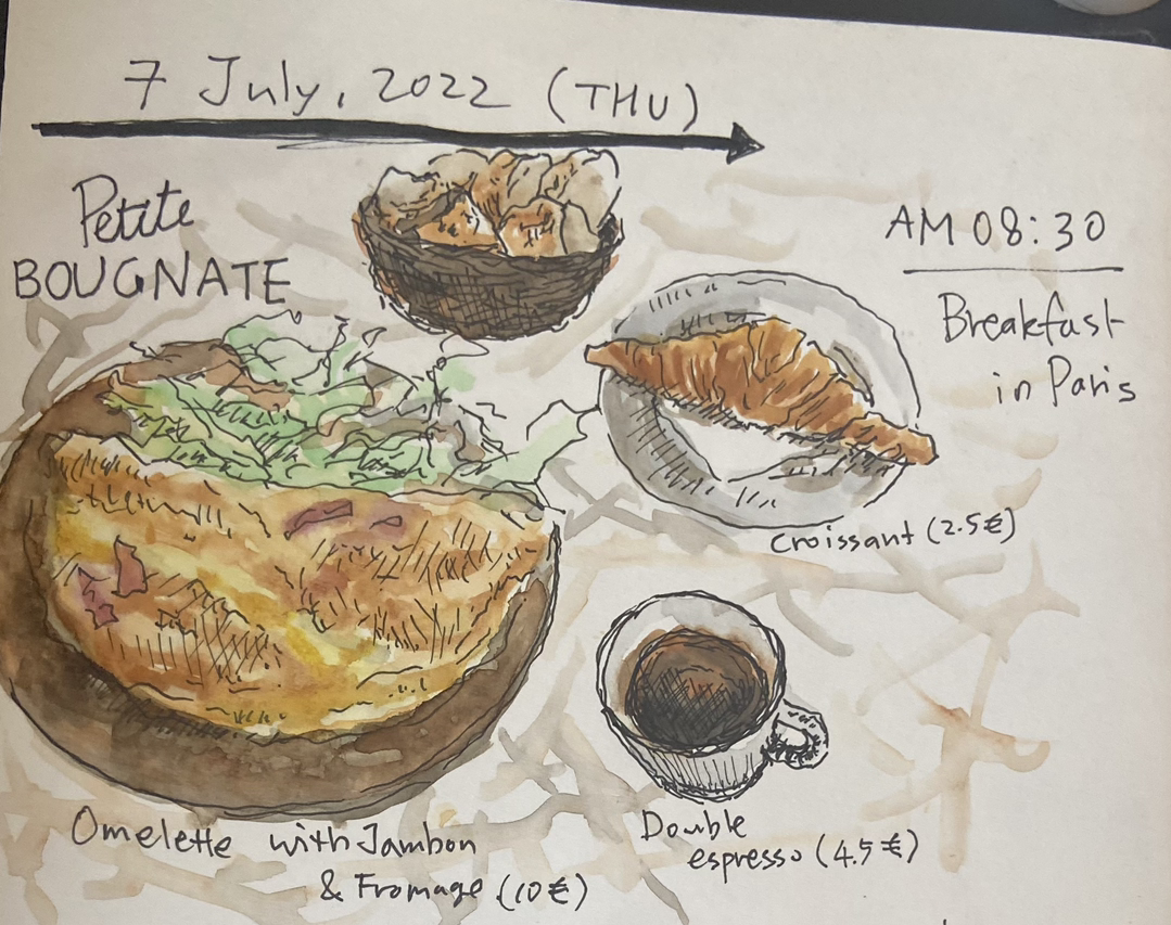 파리에서 딱히 다른 계획이 없었기에 늦잠을 자도 되지만 H와 나도 둘 다 평소 일어나는 시간이 있어서인지 7시쯤 일어나 버렸다. 둘 다 올해 들어 처음으로 에어컨을 틀고 자서, 여름에도 상쾌하게 잘 잤다. (둘 다 스트라스부르의 집에는 에어컨이 없어서 선풍기로 여름을 나고 있었다.) 여유롭게 준비를 마친 후 호텔밖으로 나왔다. 보이는 곳 중에서 괜찮아 보이는 카페로 가서 테라스에 자리 잡는다. H는 빵, 잼, 주스, 커피를 주는 기본 아침 메뉴를 시키고, 나는 잠봉에 치즈까지 모두 넣은 오믈렛을 시키고는 크로와상에 더블 에스프레소를 추가한다. 커피와 크로와상이 먼저 나와서 먹고 있는데, 오믈렛에 바게트도 곁들여 나오더라. 갑자기 양이 많아지는데, 확실히 빵 인심은 전 세계 최고인 프랑스이다. 모든 메뉴에 항상 빵이 나온다.