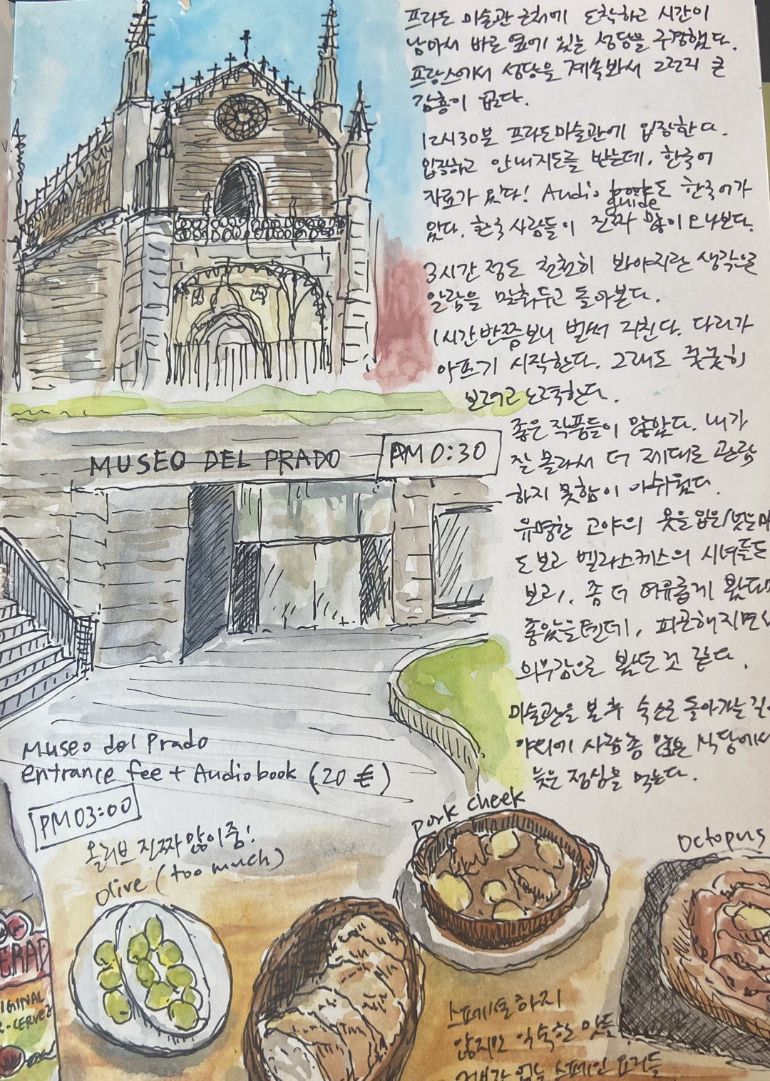 3시간 정도 봐야지-하고 생각하고 천천히 둘러본다. 1시간 반쯤 보니 벌써 지친다. 다리가 아프기 시작한다. 그래도 꿋꿋이 보려고 애써본다. 좋은 작품들이 많았다. 내가 잘 몰라서 더 제대로 관람하지 못함이 아쉬웠다. 유명한 고야의 옷을 입은/벗은 마야도 보고, 벨라스케스의 시녀들도 봤다. 좀 더 여유롭게 봤다면 좋았을 텐데, 피곤해지니 그저 의무감 같은 오기로 봤던 것 같다. 미술관을 본 후, 쉴 겸 숙소로 돌아가는 길에 야외에 사람들이 좀 많은 식당을 골라잡아 늦은 점심을 먹었다.