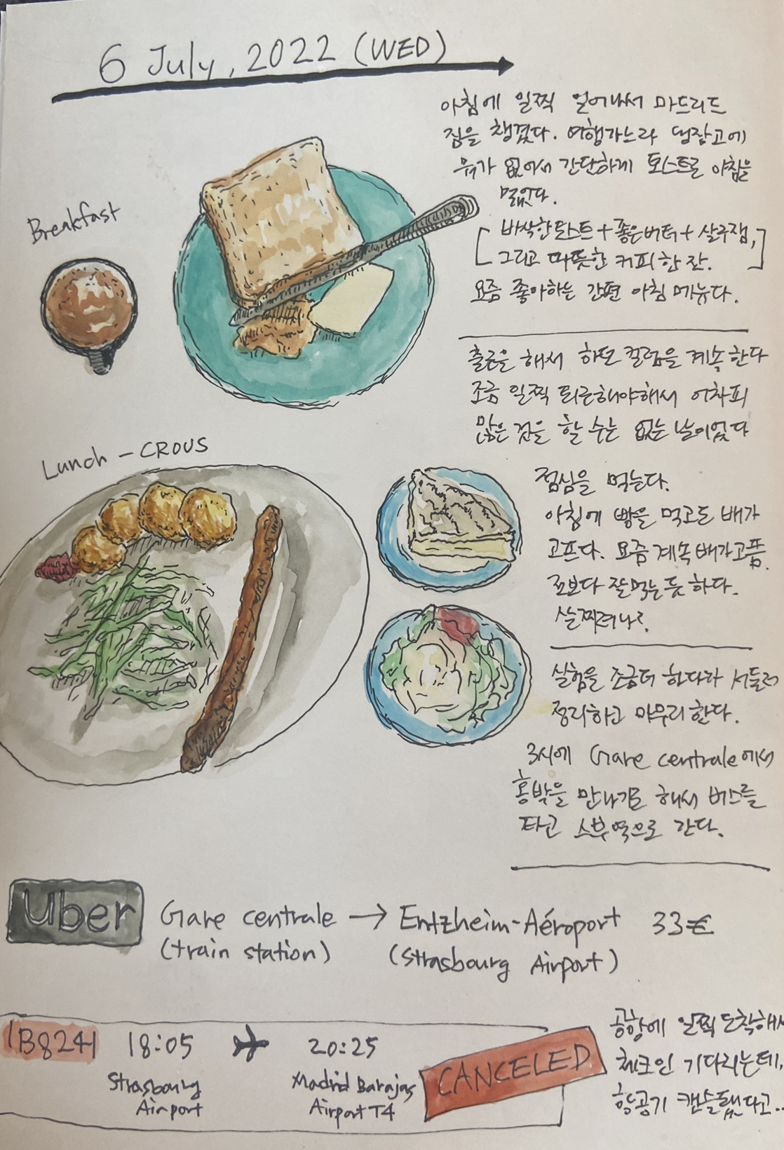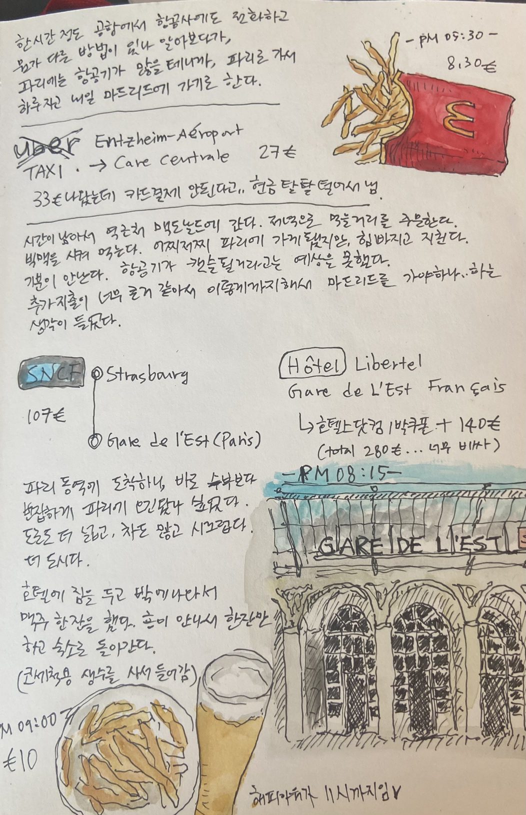 파리로 가는 기차표를 예매하고, 다시 공항에서 스트라스부르 기차역으로 택시를 타고 돌아간다. 기차 시간까지 시간이 있어 배고픈 마음에 역 근처 맥도널드에 가서 저녁으로 먹을거리를 주문했다. 기차를 타고 파리에 갔지만 힘이 빠지고 지쳤다. 기분이 안 났다. 한 공기가 캔슬될 거라고는 예상치 못했다. 추가 지출이 너무 커서 이렇게까지 마드리드에 가야 하나... 하는 생각이 들었다.
