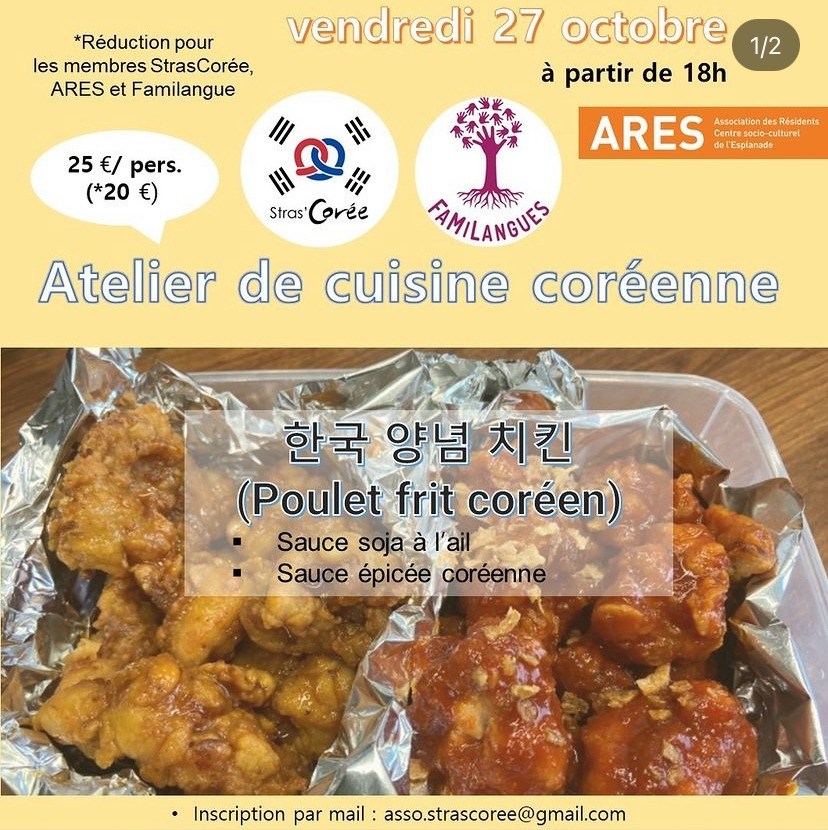 프랑스에 살면서 나는 종종 집에서 한국식 치킨을 만들어 먹는다. 이곳에서 이런 치킨을 먹을 곳은 그나마 KFC 정도인데, 다들 알겠지만 KFC와 한국식 치킨은 다르다. KFC는 보통의 한국 치킨보다 짜기도 하고, 양념치킨이 아니지 않나. 그러니 나는 나를 위해 치킨을 종종 튀기곤 했다. 그러다가 친구를 초대해 함께 치킨을 튀겨 축구 경기를 보기도 하고, 연구실 동료들과의 포트럭 파티에 한국식 치킨을 가져가기도 했다. 그렇게 한국 지인, 외국인들에게 내 치킨을 몇 번 맛 보였는데 모두가 좋아했다. 그래서 쿠킹 아뜰리에를 하면서 한 번은 한국 치킨을 메뉴로 진행하고 싶은 욕심이 있었다. 다만 기름에 튀겨야 하는 양이 만나는 게 조금 마음에 걸렸다. 하지만, 초벌 튀김을 해간다면 보다 간편하게 해낼 수 있을 것도 같았다. 조금 모험이었지만, 치킨 쿠킹클래스를 하기로 마음먹는다.