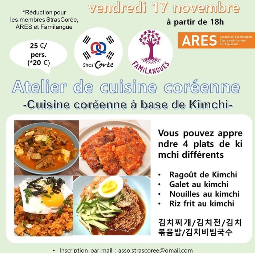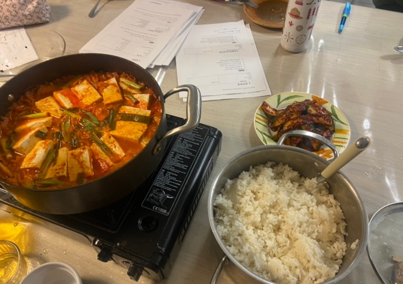 퇴근 후, 짐을 짊어지고 쿠킹 클래스 장소로 간다. 이날 밥도 함께 먹어야 하니, 사람들이 오기 전에 미리 밥을 한다. 그런 후, 사람들이 하나하나 오면서 인사를 나누고 레시피를 나눠준다. 이번에는 순차적으로 요리를 하기로 했다. 이전에는 이거 하다가 저것도 하고 이런 식으로 했었는데, 사람들이 조금 어려워하는 것 같더라. 그래서 순서대로 만들어 하나씩 맛을 보고 다음으로 넘어가기로 했다. 제일 먼저 할 것은 김치전이었다. 워낙 쉬운 거라 금방이었다. 김치를 자르고, 부침가루와 물을 이용해 반죽을 만들어 잘 섞어준다. 넉넉히 기름을 둘러준 팬에 김치전을 바삭하게 익혀낸다. 역시나 사람들이 잘 먹는다. 첫 번째 요리는 성공이다. 이제 두 번째 요리는 바로 비빔국수이다. 김치를 잘게 자르고, 비빔양념장을 만들어 잘 섞어준다. 소면을 삶아 물에 헹구고 물기를 빼서 준비하고는 양념장을 얹어준다. 미리 준비해 온 계란도 얹어 마무리한다. 비주얼도 예쁘고 맛도 좋은 김치비빔국수 완성이다. 그다음으로는 김치볶음밥이다. 미리 팬에 계란프라이도 준비해 둔다. 그런 후, 그 팬에 김치를 볶고 밥을 넣어 함께 볶아준다. 내 김치볶음밥의 조금 다른 점이라면, 고추장을 살짝 넣어주는 것이다. 개인적으로 이렇게 하면 더 진한 맛이 난다고 생각한다. 김치볶음밥을 완성하고 계란 프라이를 얹고, 파송송 썰어 뿌려주고 깨까지 뿌려주니 예쁜 김치볶음밥이 완성되었다. 이날은 모든 요리들이 맛도 좋고 비주얼도 좋은 느낌이다. 사람들이 요리 하나가 완성될 때마다 여기저기서 사진을 찍었다. 뿌듯했다. 이제 마지막은 바로 김치찌개이다. 고기는 삼겹살을 준비했다. 고기가 아주 넉넉하게 있고, 마지막 요리라서 남은 김치를 몽땅 넣고 국물까지 모두 넣는다. 고기도 듬뿍 넣어서 찌개를 끓여주고, 마지막쯤 두부를 가지런히 정렬시키고 파를 얹어내어 완성한다. 김치찌개까지 먹기 좋은 모습이다. 통역을 도와주는 한국인인 한글학교 교장선생님이 맛을 보더니 너무 맛있다고 했다. 프랑스인들도 잘 먹지만, 한국인의 반응이 진짜이기에 이번 요리가 성공적이라는 것을 알 수 있었다.