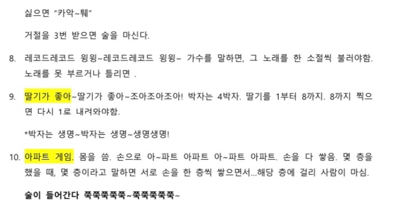 홍보가 시작하고 사람들이 꽤 관심을 보였다. 이제 사람들에게 알려준 한국 술예절들에 대해 알아봐야 했다. 내가 한국에서 학교에서 있었기에 사회생활을 하지 못해 제대로 된 술예절을 몰랐다. 인터넷의 글들을 찾아보고 유튜브에서 영상 등을 통해 한국의 술 예절, 주도에 대해 알아보았다. 내가 생각했던 것보다 더 까다로웠다. 뭘 이렇게까지 해야 하나 하는 생각이 들기도 했다. 하지만 이게 예절이라니까, 알려줘야 한다는 생각으로 열심히 익혔다. 그런 후, 술게임도 알아보았다. 나는 술게임을 정말 싫어한다. 단 한순간도 술게임을 재밌게 한 적이 없다. 술을 마시게 하기 위한 게임이란 것 자체가 싫다. 게다가 순발력도 없어서 술게임을 하면 지는 경우가 많아 억지로 마셔야 한다. 이런 모든 게 싫다. 하지만, 사람들에게 가르쳐야 하니 술 게임을 배우기 위해 유튜브에 들어간다. 코로나 시즌을 겪으면서 신입생들이 제대로 오티나 엠티를 가지 못하면서 술게임을 잘 배울 기회가 없었나 보다. 대학교들의 공식유튜브 채널들에서 술 게임을 알려주는 영상들이 제법 있더라. 거기서 난생처음 보는 다양한 술게임들을 익혔다. 그 내용들을 정리해서 자료를 준비했다. 클래스에서 사람들에게 나눠주기 위함이었다.