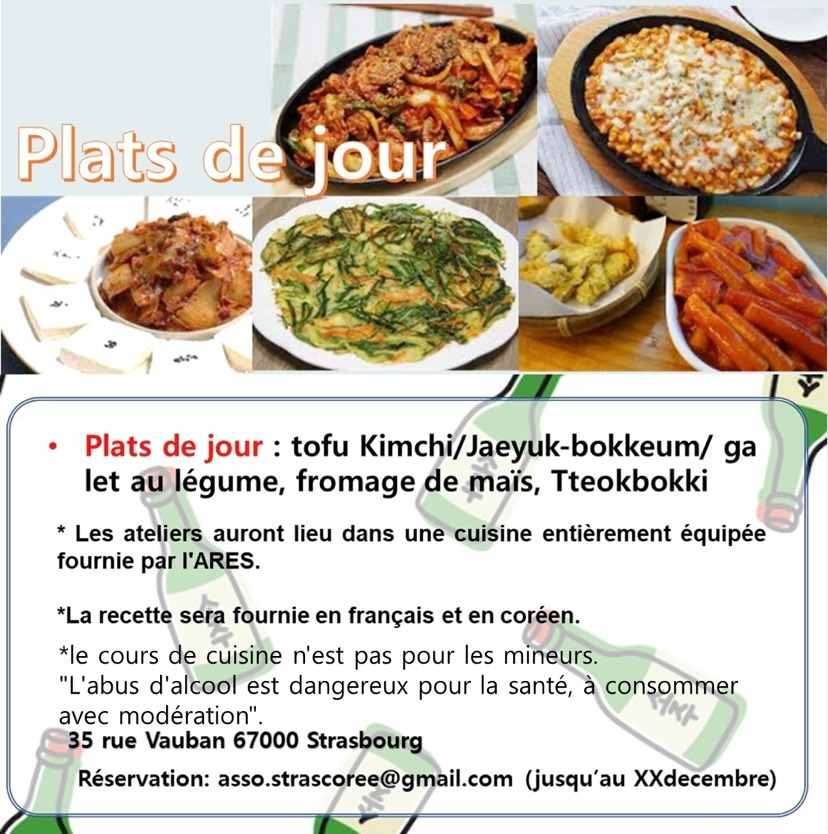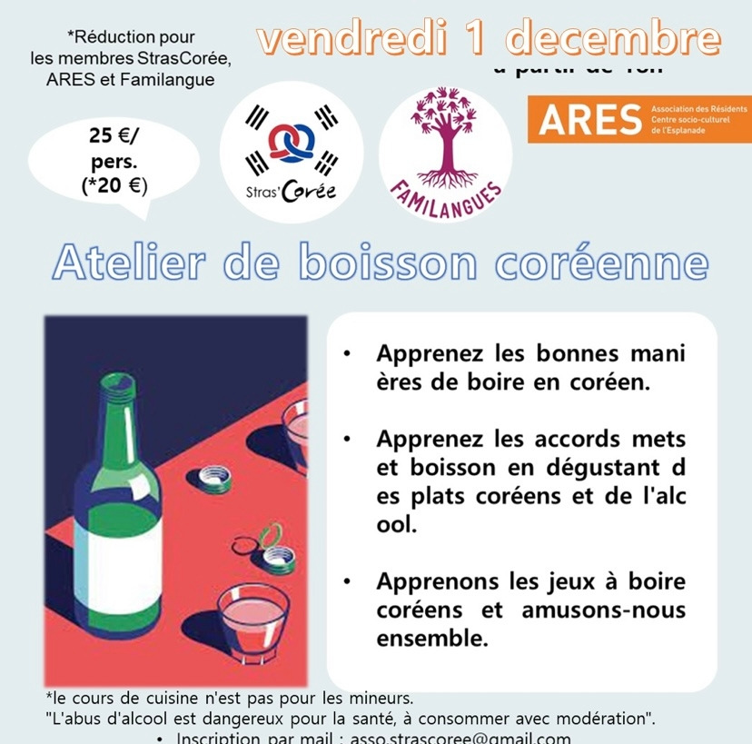 한국의 술이라 하면, 먼저 소주가 있고 그다음 맥주, 막걸리 정도일 것이다. 각 술들에 어울릴 수 있는 안주들을 생각해내야 했다. 막걸리라면 당연, 전이다. 파전을 하면 될 것 같다. 맥주는 치맥으로 치킨이 답이지만, 치킨을 하기는 버거울 것 같았다. 그래서 생각한 것이 떡볶이에 튀김이다. (최근 아시아마켓에 한국식 냉동 고구마, 단호박 튀김이 들어온 것을 봤던 기억이 났다.) 여기에 소주안주로 매콤한 제육볶음이면 될 것 같았다. 메뉴가 조금 허전해서 조금 더 고민해서 생각한 게 두부김치였다. 그런 후, 한식 같지 않지만 한국에서 처음 시작된 안주 콘치즈가 생각나서 콘치즈까지 준비하기로 한다. 그렇게 메뉴가 정해지고는 포스터를 만들었다. 홍보를 시작한 후, 프랑스 지인들에게 연락이 왔다. 프랑스에서는 술이 있는 자리를 홍보할 때는 술에 대한 위험을 알리는 주의문구를 반드시 삽입해야 한다고 했다. 그래서 수정된 포스터를 만들어 다시 홍보를 진행했다.