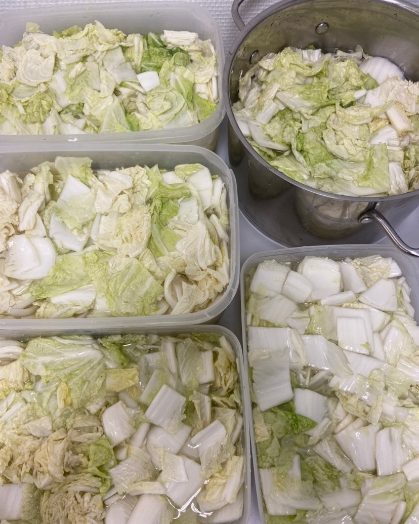 금요일에 아뜰리에를 하는데 그 주 화요일에 이미 12명의 신청자가 있다고 했다. 그리고 그중 절반의 사람이 배추/무 모두 만들고 싶다고 했다. 이왕 사람 받는 거 15명까지 받자고 하고 바로 다음날쯤 15명 최종 인원이 확정되어 모집을 마감했다. 이런 적은 처음이었다. 사람 수가 많아 긴장되기도 했다. 김장 재료들을 한 번에 장보기도 어려워 두 번에 걸쳐 장을 봐왔다. 목요일 퇴근 후에 배추를 들고 아뜰리에 장소로 갔다. 혼자 다 사 오지 못한 배추를 교장선생님이 조금 더 사 오셨다. 김치를 적당한 크기로 모두 잘라 소금물 염도 15% 정도에 푹 담가두었다. 다음날이면 충분히 절여져 있을 것이다.
