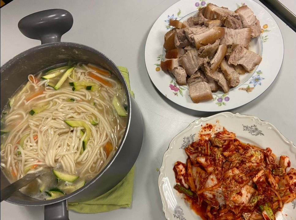 김치 담그기를 마치고는 테이블을 정리하고, 요리한 칼국수와 된장삼겹살수육을 잘라 식탁에 차려내고 시연 때 만든 김치를 곁들여 낸다. 사람들이 맛을 보기 시작한다. 된장수육이 인기가 아주 좋았다. 사람들이 너무 부드럽다며 어떻게 만든 거냐고 묻곤 했다.
