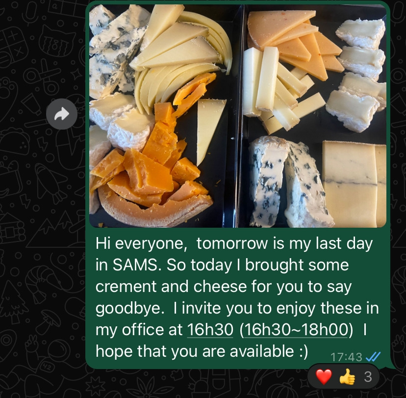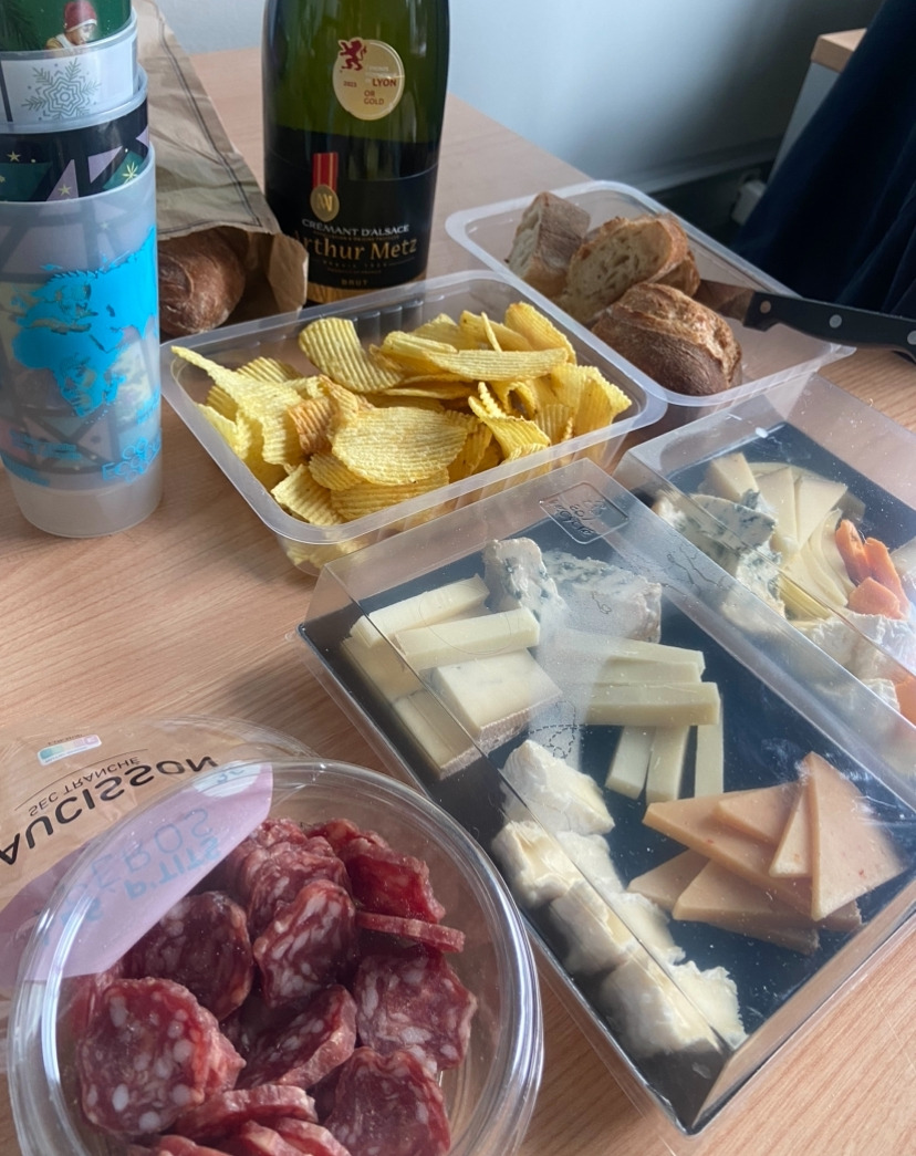 연구실에서의 마지막 주간은 정신없이 지나갔다. 실험을 마무리하고, 가지고 있는 샘플들을 모두 리스트업 하고 정리하여 인수인계까지 마친다. 실험노트도 모두 점검하고 내가 있던 자리에 먼지 한 톨 정도만 남기고 모두 비우고 정리한다. 마지막 날은 분명 정신없을 것을 알았기에, 그 전날 연구실 사람들과 인사와 대화를 나눌 자리를 마련하기로 했다. 프랑스인들이 많으니 그들이 좋아할 수 있는 다과거리를 챙겨가자고 생각했다. (원래는 한국 음식을 조금 해서 차릴까 했지만, 떠날 준비를 하느라 요리할 것을 준비하는 것도 번거로웠다.) 그래서 고른 것이 치즈와 쏘시쏭(생소시지)이었다. 그리고 음료로 알자스의 스파클링 와인인 크헤멍을 준비했다. 그렇게 준비한 것들을 아침 출근길에 챙겨 들고 연구실에 도착한 후, 단체 왓츠앱방에 메시지를 남겼다. 오늘 4시 반쯤에 준비된 다과를 즐기며 인사를 나누자고 말이다.