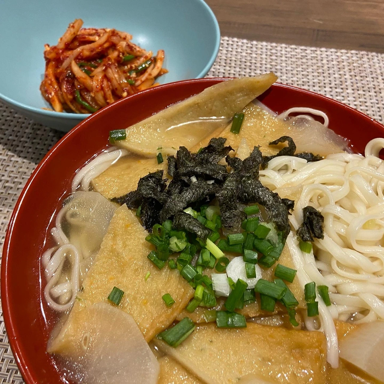 어묵볶음을 만들어 반찬으로 냉장고에 넣어두었다면, 그다음은 어묵국수를 만들어보자. 어묵 국수로 1인 식탁의 한 끼를 때울 수 있을 것이다. 먼저 육수를 내줘야 한다. 멸치, 다시마로 육수를 열심히 만들어주면 좋고, 그게 아니라면 코인 육수 같은 간편한 시판 육수 도우미를 쓰거나, 아니면 조미료를 이용해 육수를 만들어도 좋다. 육수를 끓일 때 무를 잘라 넣어주면 국물도 시원해지고 나중에 익은 무도 건더기로 먹을 수 있어서 좋다.
