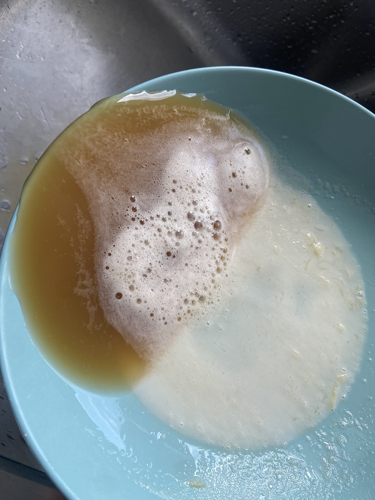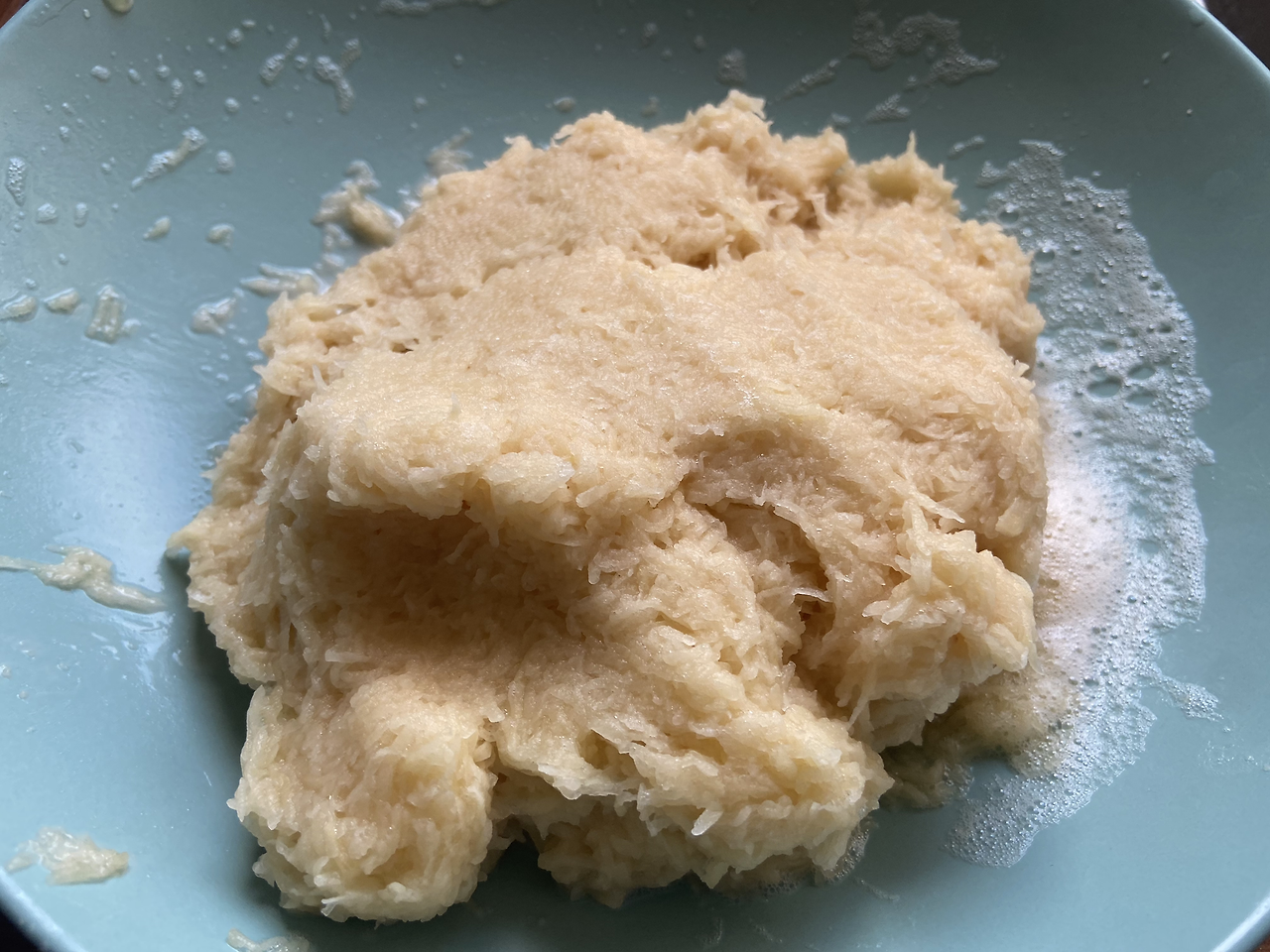 감자가 다 갈아지면 감자를 면포 같은 것으로 꾹 짜서 건더기만 건져내야 하는데 면포가 없으면 가는 체에 걸러줘도 된다. 손으로 꾹꾹 눌러 물기를 빼준다. 그렇게 빼낸 수분은 잠시 놔둔다. 잠시 딴짓하다가 온다. 유튜브로 영상 한두 개 보자. 그러면 전분이 가라앉는다. 위에 둥둥 떠있는 수분만 조심히 따라내고 가라앉은 전분을 감자 찌꺼기와 함께 섞어준다. 소금 간을 해준다.