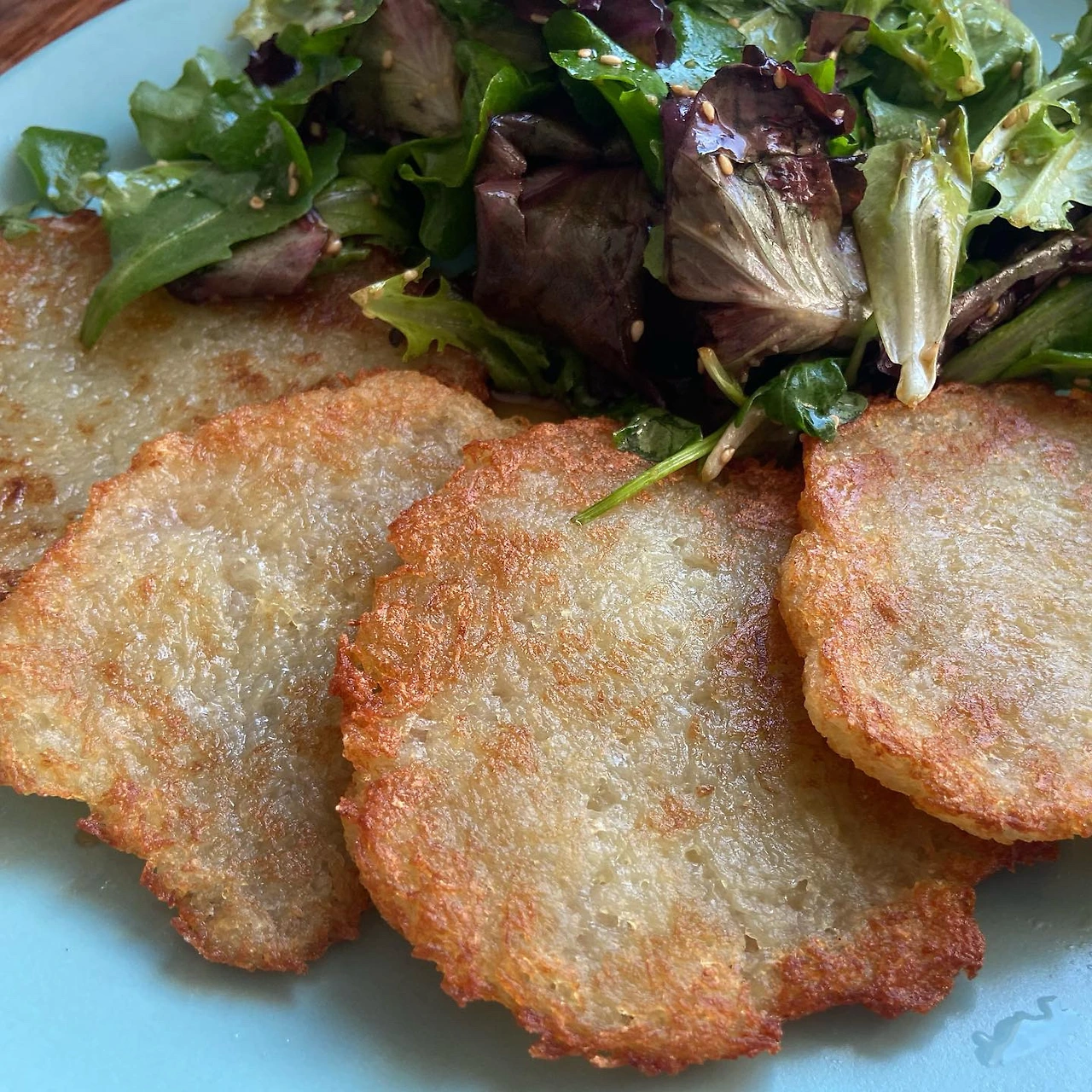 전을 해보면 알겠지만 기름은 무조건 넉넉히 해야 한다. 기름을 아껴 쓰거나 살이 찔까 걱정된다거나 하면 그냥 전을 먹지 말자. 넉넉한 기름이 달궈지면 감자 반죽을 원하는 크기가 나올 만큼 팬에 얹어서 납작하게 눌러 펴준다. 치이익 소리가 벌써부터 맛있다. 나는 바삭한 바깥 부분이 좋아서 감자전을 작게 부치는 걸 좋아한다. 양쪽 면 바삭하게 구워지면 감자전 완성이다. 바삭함이 사라지기 전에 서둘러 먹자!