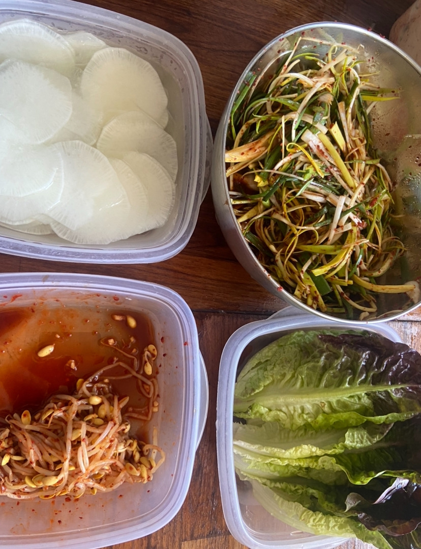 한국식 바비큐를 위해 돼지고기 목살을 미리 두 가지 양념에 재워뒀다. 간장양념/고추장양념 두 종류로 말이다. 쌈을 싸 먹는 법을 알려주고자 미니상추도 준비해 두고, 파절이 (파 대신 리크사용) 대용도 만들고, 미리 쌈무도 절여두었다. 곁들임으로 콩나물 무침까지 했다. 마지막으로는 불려두었던 녹두로 녹두전을 부치고, 냉동실에 있던 오징어로 오징어무침을 하여 애피타이저까지 준비했다. 모든 준비가 끝났다.