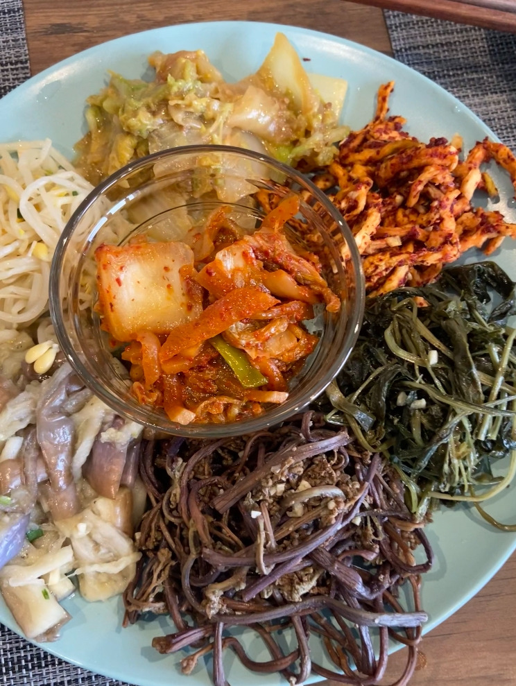 점심 식사로 시작되었는데, 본식 2를 먹을 때가 되니 오후 4시가 되었다. 순두부찌개를 데우고, 각종 반찬을 그릇에 담아 가져다준다. 미리 해둔 밥도 챙겨간다. 각자 밥과 순두부찌개를 떠주고, 그릇에 원하는 반찬을 가져가서 먹도록 안내한다. 한국에서 먹는 방법으로는 국에 밥을 말 수도 있다고도 말해준다. 그런 다음, 반찬 하나하나를 설명해 주는데 고사리의 영어이름을 알려주자 "그거 공룡 때부터 살던 거 아냐?!"라며 흥미로워했다. 순두부찌개를 먹자마자 맛있다며 좋아했다. 고사리는 생각한 맛이 전혀 아니라고 했고, 무말랭이의 식감과 그 맛을 무척 좋아했다. (집에 갈 때 무말랭이를 싸갔다.) 내가 각종 나물들로 비빔밥도 만들 수 있다며 한국의 대표 음식 중 하나라고 알려주며 비빔밥도 선보였다. 각종 반찬들과 밥, 순두부찌개를 먹다가 친구는 결국 순두부찌개에 밥을 말았다. 그러더니 밥을 말았더니 그 수프맛이 더 잘 느껴진다고 했다. 계속해서 먹으며 정말 많은 대화들을 나눴다.