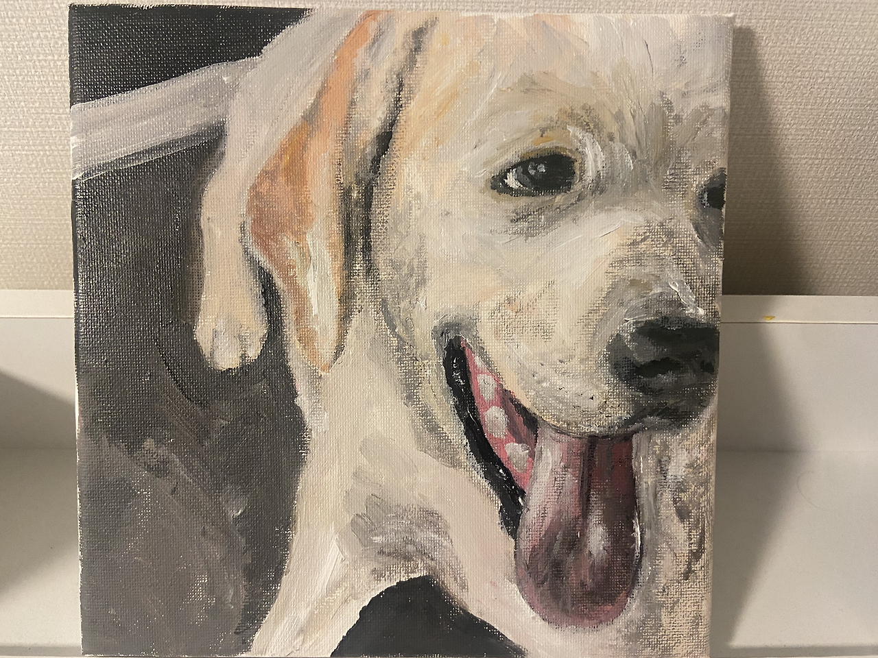 스케치 후에는 색칠을 시작한다. 아크릴 물감으로 필요한 물감들을 짜본다. 하얀 개라서 약간의 갈색과 흰색이면 거의 다 칠할 수 있을 것 같다. 역시 언제나처럼 코를 색칠하는 것이 어렵다. 검은색을 사양하다 보니 너무 진하게 칠해버리면 돌이킬 수 없을 것 같아 소극적으로 칠하게 된다. 혀를 내밀고 있어서 혀를 칠하는데, 생각보다 색칠하기가 어렵다. 사진 속에 디테일한 혀의 색감을 표현하기가 어렵다. 계속 덧칠하며 최대한 비슷한 색감을 내려 애써본다. 어느 정도 칠한 것 같은데 혀가 금속 같은 질감으로 칠해져 버렸다. 수정하고 싶지만 어떻게 해야 원하는 느낌이 나는지 알 수가 없어서 더 건드리지 않는다.