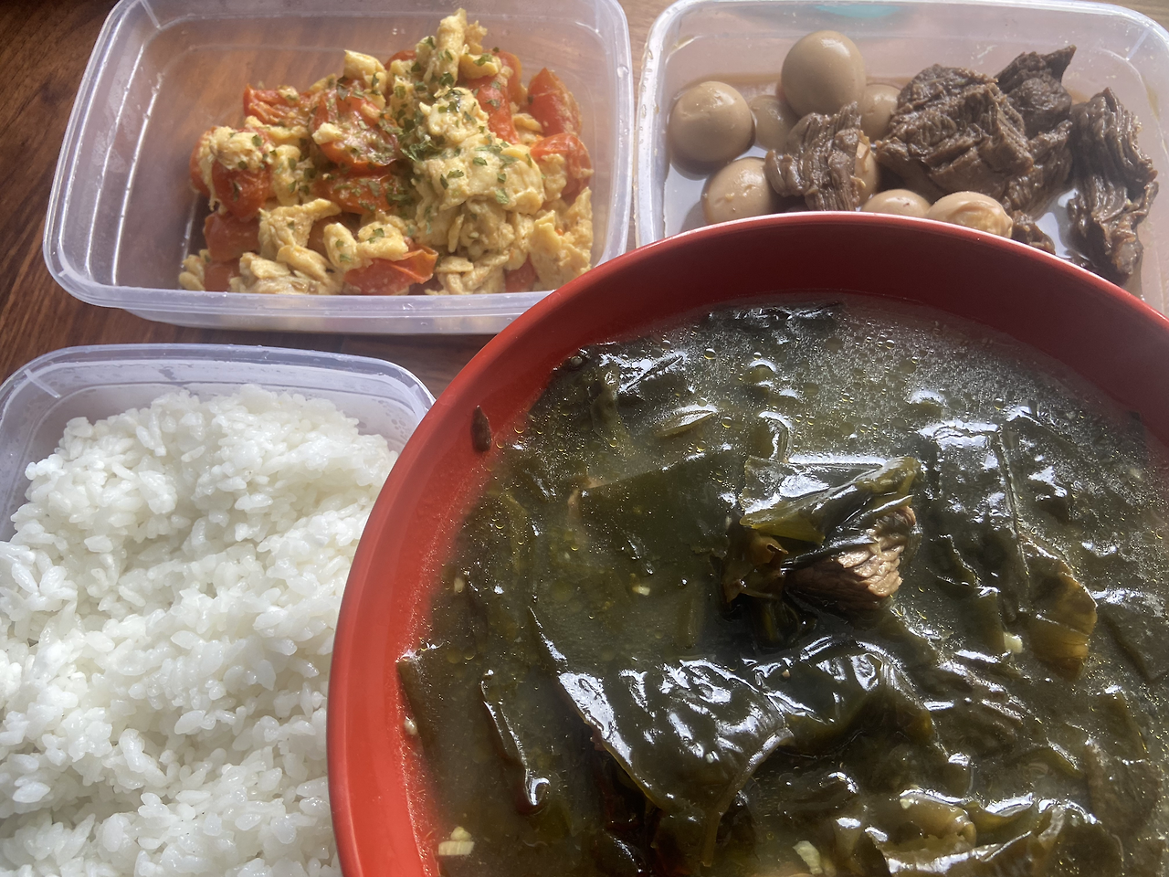 미역국에 대해서는 예전에도 글을 적었었기에 딱히 크게 적을 것은 없지만, 혹시나 못 보신 분들을 위해 간단하게 미역국 레시피를 적어보고자 한다. 나는 이곳에서 소고기가 저렴하기에 미역국 용 고기도 그릴용, 구워 먹는 고기 재료로 사서 미역국을 끓인다. 먼저 잘라 둔 고기를 참기름에 볶아주다가 불려둔 미역을 넣는다. 국간장을 한 두 스푼 넣고 함께 볶아주다가 물을 붓는다. 국이 팔팔 끓으면 중 약불로 불을 내리고, 다진 마늘을 넣고 계속 끓여내 준다. 미역국의 미역은 빳빳하지 않고 부들부들해야 맛있기 때문에, 고기 육수가 충분히 우러나고 미역이 부들부들할 때까지 충분히 끓여준다. 그런 후, 마지막으로 다시 간을 보고, 부족한 간을 국간장이나 소금으로 채운다. 따뜻한 한국인의 감성, 미역국 완성이다.