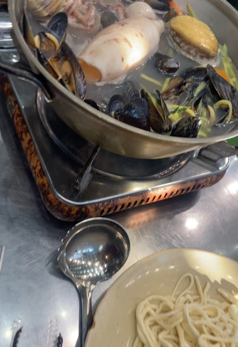 아침 7시45분 비행기라서, 일찍 공항에 가기위해서는 집에서 공항버스 첫 차를 타야했다. 하지만 혹시나 첫 버스를 놓치는 경우나, 버스에 사람이 너무 많아서 혹시라도 (난 걱정이 많은 타입이라) 못 타는 경우를 대비해 인천 공항 근처에서 숙박하는 게 좋겠다고 생각을 했다. 그래서 미리 공항 근처에 숙박을 잡아두었다. 엄마가 고향 집에서 기차를 타고 서울에 올라오셨다. 기차역으로 짐을 챙겨 엄마를 마중 나갔다. 그런 후, 함께 기차역에서 인천공항 행 공항버스를 탔다. 한국이 너무 더웠다. 걱정했는데 최근에 베트남 다녀온 친구가 말하길 "한국이 더 더워"라고 했기에 동남아로 떠나면서 크게 걱정되지 않았다. 한국이 더 더울 거란 생각이 들어서였다. 시원한 버스를 타고 인천공항에 도착했다. 공항에서 유심을 구매하고, 무료 셔틀을 타고 공항 근처 숙소로 갔다. 인천 공항 근처라 바다 근처였다. 엄마는 칼국수 매니아시다. 한국 떠나기 전 저녁 식사로 해물 칼국수가 좋을 것 같았다. 숙소에서 잠시 쉬다가 엄마와 함께 영종도 근처 해물 칼국수를 먹으러 갔다. 해산물이 듬뿍 담겨있어서 먼저 끓여서 먹다가 마지막 육수에 칼국수를 넣어 끓여 먹는 거였다. 엄마는 해산물을 많이 드시고, "엄마는 배불러서 칼국수는 조금이면 돼"라고 하시며 두 젓가락 가져가셨지만, 한 입 드시고는 계속 떠드시더라. 역시 칼국수를 좋아하는 분이구나 싶었다.