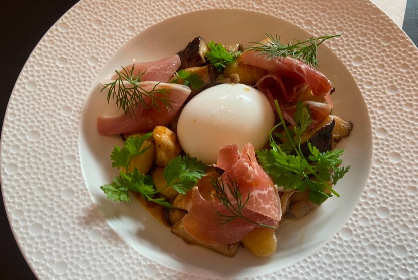 빵이 나오고, 홈메이드버터가 나왔다. 나름 탄수화물을 제한 중이기에 식사 전에는 빵을 자제하고 테린이 나오길 기다렸다. 테린은 이미 만들어진 것을 잘라서 서빙하는 것이기에 아주 금방 나왔다. 말린 자두와 피스타치오가 중간중간 박혀있었고, 양파피클과 머스터드가 함께 나왔다. 오리고기와 삼겹살 테린이었다. 오래간만에 먹는 테린은 좋았다. 사실 어떤 게 맛있는 테린인지는 모른다. 그저 먹고 맛있었으니 만족하는 거다. 그냥 먹을 때와 머스터드, 양파피클을 곁들일 때는 또 다른 맛이었다. 이렇게 테린을 천천히 먹고 있는데, 조카를 위한 버섯, 계란 요리가 나왔다. 조카에게 계란을 가르면 예쁜 노른자가 흘러나올 거라며 자르라 하고 그 모습을 사진으로 찍었다. 예상했던 대로 아주 무난한 맛이었다. 조카가 너무 잘 먹기에 한번 맛본 후에는 더 달라 할 수가 없었다.
