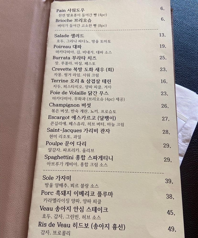 언니가 예상보다는 늦지 않아 딱히 기다렸다는 느낌이 없었다. 메뉴판을 들여다보며 고심했다. 잘 고르고 싶었다. 앙트레로 하나쯤 고르고 조카용 메뉴 하나, 그리고 언니와 내가 각각 메뉴 하나씩 고를 생각이었다. 앙트레로 고민하다가 내가 좋아하는 테린을 골랐다. 프랑스에서 지낼 때 빠떼를 종종 먹었고 좋아했다. 그와 비슷하게 고기 간 것을 뭉쳐둔 테린과 빵을 먹고 싶었다. 빵은 사워도우와 브리오슈가 있었다. 식사용으로는 버터가 너무 많은 빵은 선호하지 않아서 사워도우로 골랐다.