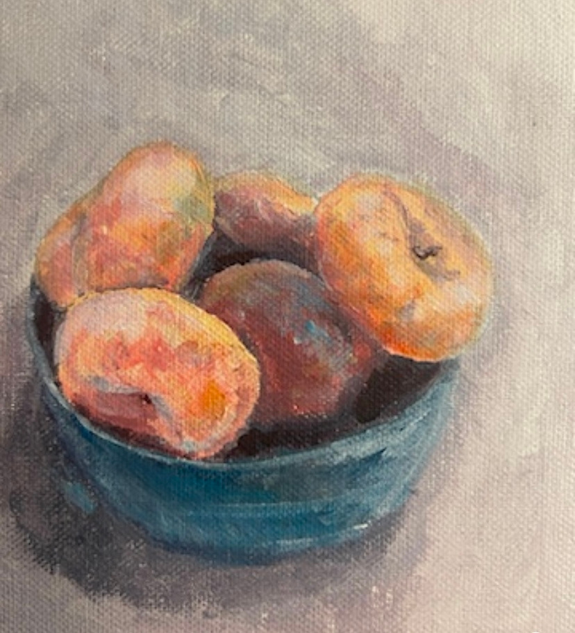 복숭아를 보고는 언니가 생각났고, 그 복숭아를 그리고 싶어졌다. 마침 새로 사두었던 20cmx20cm의 작은 캔버스와 아크릴 물감이 있었다. 둘 다 제대로 써본 적이 없는 것들이었지만 연필로 간단한 스케치를 하고 색칠을 시작했다. 워낙 작은 사이즈라 30분이 채 되지 않나 완성되었다. 처음인데 생각보다 괜찮게 그려진 것 같았다. 사진을 찍어 언니에게 보냈다. 답장이 왔다.
