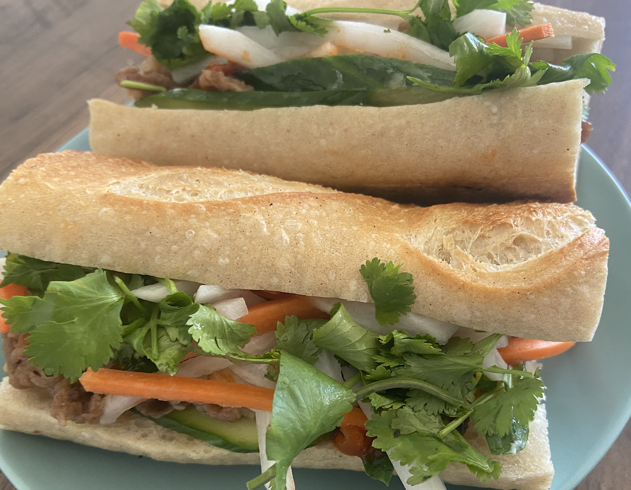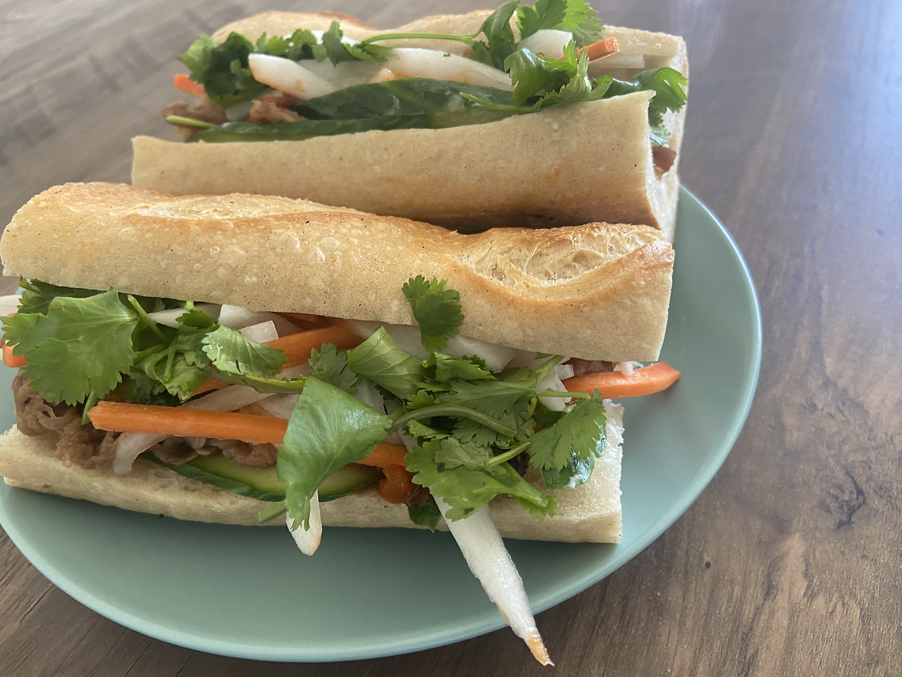 먼저 바게트를 반 가른다. 완전히 두 동강 나게 가르지 말고 접을 수 있게 반 갈라준다. 그런 후, 촉촉하게 빵 안쪽면에 마요네즈를 발라준다. 바닥면에 슬라이스 해둔 오이를 얹고, 햄 또는 고기를 얹은 후, 스리라차 소스를 뿌려준다. 그 위에 준비해 둔 무, 당근 피클을 얹고 취향껏 고수를 넣는다. 반미 샌드위치 완성이다!