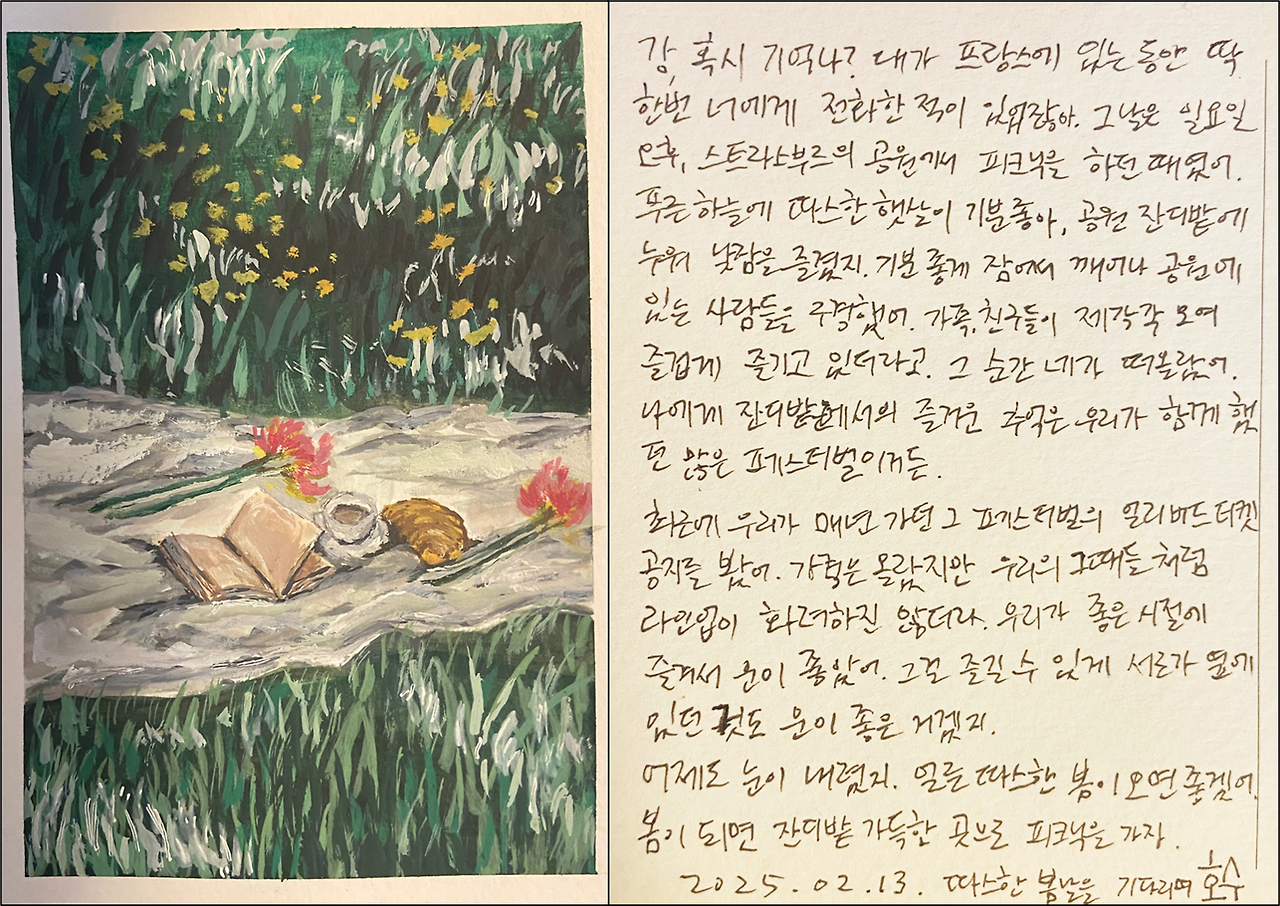 코로나 시기에 스트라스부르에서 연구원으로 일을 하게 되어 한국을 떠나 있었다. 누구나 비슷했겠지만, 사람을 만나는 것이 쉽지 않아 한동안 집과 연구소만 오가는 생활이었다. 그러다 시간이 흘러 마스크를 벗고 자유롭게 돌아다닐 수 있게 되었을 때, 처음으로 공원에서 피크닉을 했다. 도시락을 싸와서 함께 온 친구와 즐기고는 따뜻한 햇살이 기분 좋아 낮잠을 즐겼다. 잠에 들 때만 해도 주변이 제법 조용했었는데, 어느 순간 조금씩 사람들이 몰려들어 제법 활기찬 분위기를 보였다. 잠에서 깨어나 주변을 둘러보니, 아이와 함께 온 가족부터 친구들이 모여 와인을 마시기도 하고 보드게임을 즐기는 모습들을 보니 평화로웠다. 문득, ‘아 이 느낌 아는데…’라는 생각이 들었다. 이 잔디밭에 앉아있는 내가 익숙했고 그 순간 잔디밭 위에 함께 앉았던 내 친구 강이 떠올랐다.
