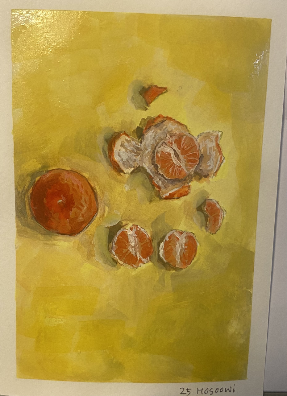 다른 친구들에게도 그림을 그리고 메시지를 담아본다. 결혼하며 원래 고향인 제주로 돌아간 친구이다. 겨울 제주하면 떠오르는 감귤을 그려본다. 어째서인지 그림이 너무 잘 그려졌다. 베스트 작품이 나와버렸다. 쨍쨍한 샛노란 빛의 예쁜 엽서가 완성되었다. 엄마가 되어 행복한 얼굴을 하고 있던 친구의 모습에 대해 메시지를 적어낸다. 그녀가 찾은 행복을 축하해 주고 제주도에 놀러 갈 테니 얼굴을 보자고 말한다.