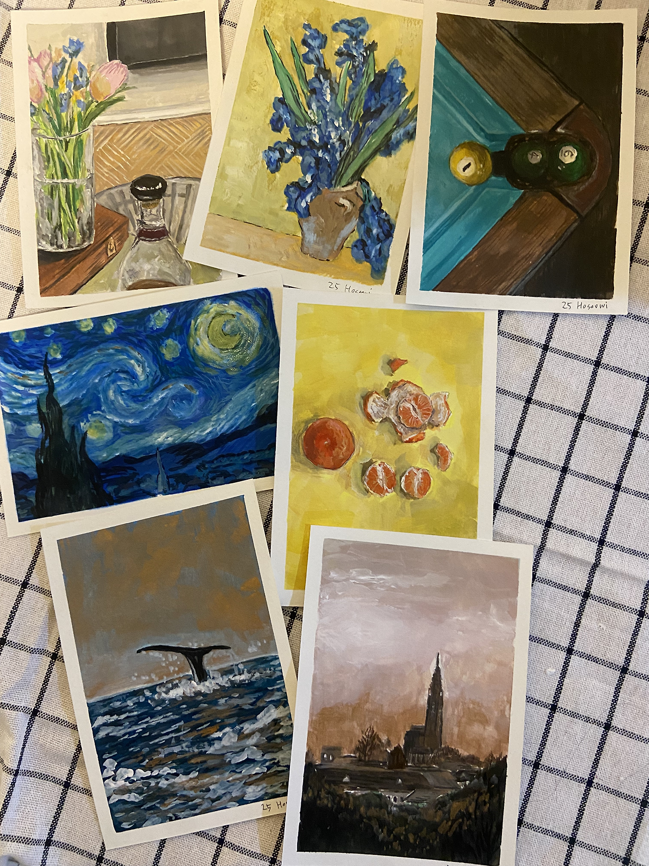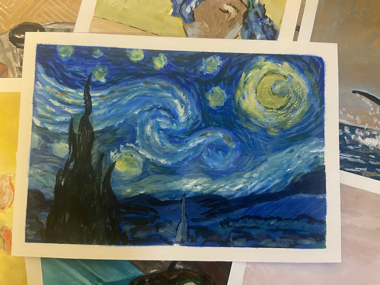 언제나처럼 그림을 모두 그리고는 제일 친한 친구 "강"에게 사진 찍어 보낸다. 반고흐풍의 꽃 사진을 좋아한다. 다른 작품들도 카피해볼까 하는 생각에 (카피라 말하기 부끄럽지만) 어떤 작품을 좋아하는지 묻는다. 몇몇 작품을 말하기에 그중에 그 유명한 "별이 빛나는 밤에"를 골라 따라 그려본다. 사실 처음에는 모네의 "수련" 중에서 한 작품을 골랐지만, 물감이 덕지덕지 발라져 정확한 형태가 구분되지 않는 모네의 그림을 내 실력으로 따라 할 수가 없었다. 과감하게 그리다가 포기하고는 바로 진한 파란색으로 뒤덮는다. 반고흐의 그림을 따라 그리기로 한다. 그렇게 슥슥슥 그려본다. 어차피 크게 노력할 필요 없다. 노력해서 똑같은 그림이 그려질 리가 없다. 그저 느낌만 내보려 그려본다. 그런 후 사진을 찍어 강에게 보낸다. 방금 그린 거냐고, 이렇게 빨리 그려냈냐며 대단하다고, 너무 예쁘다 좋아한다. 오늘의 마지막 엽서까지- 모두 잘 마무리가 되었다.