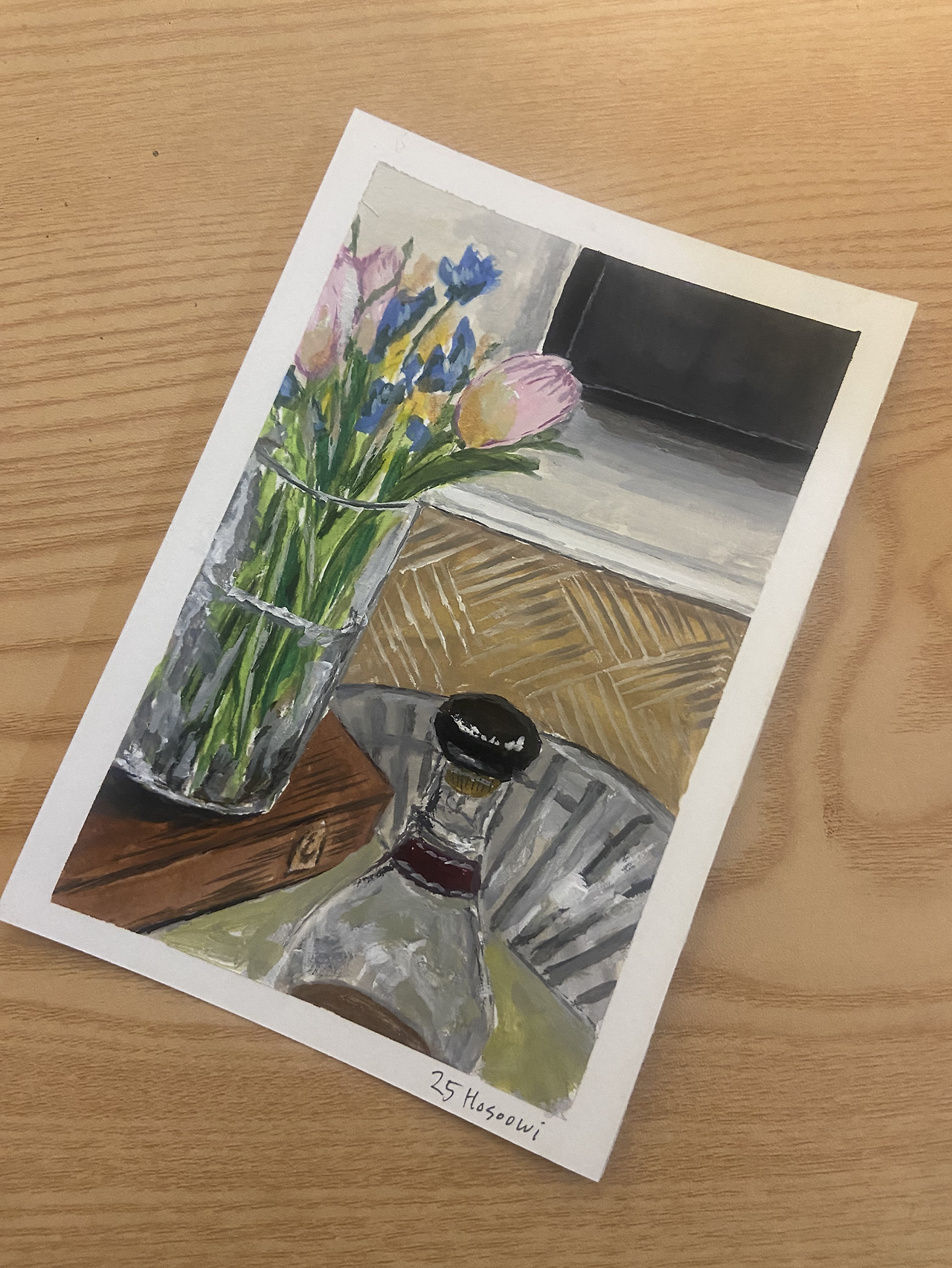 또 다른 친구를 위한 그림을 그린다. 그 친구가 요즘 일로 힘들어하기에 즐거움을 상기시킬만한 것을 그리고 싶었다. 예전에 드럼을 치던 친구기에 드럼을 그릴까 하던 차에, 단체방에 휴식을 취하는 사진이 올라왔다. 꽃이 장식된 아늑한 집 거실에서 위스키를 마시는 사진이었다. 그에게는 이게 휴식이구나 하는 생각에 꽃병과 위스키를 그려본다. 썩 맘에 드는 그림이 나오지 않아 아쉬움이 있었다. 다음번에 더 예쁜 엽서를 보내자는 마음을 가지고 엽서를 그대로 보내기로 한다. 친구에게 요즘 일이 너무 힘들어 지쳐 보인다며, 힘내라고 말한다. 언젠가 힘내라는 말이 지치게 한다고 누군가가 방송에서 얘기한 것을 들은 적이 있다. 이미 힘내고 있는데 뭘 더 힘내라는 거냐고 말이다. 문득 그 말이 떠올랐다. 이 친구도 분명 힘내고 있을 테니, "이미 충분히 힘을 내고 있다면, 장하다고 칭찬할게!"라며 엽서를 마무리한다.