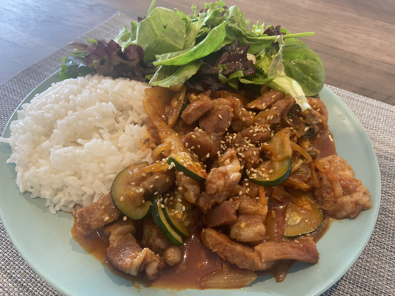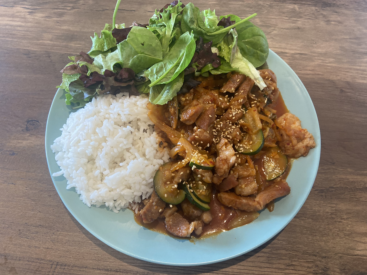 코로나로 격리 중에 돼지고기와 채소볶음을 했는데 컨디션이 안 좋았던 건지 네 맛도 내 맛도 아닌 어정쩡한 맛이 되어버렸다. 그래서 생각해낸 답이 바로 김치였다. 갖은 채소와 돼지고기가 볶아진 상태에 김치를 넣고 함께 다시 볶아주기 시작했다. 고춧가루, 간장, 다진 마늘, 설탕을 넣어주었다. 김치를 볶을 때는 김치의 신맛을 잡기 위해 설탕을 좀 넣는 편이다. 김치가 좀 더 물러버리는 게 좋았기에 물을 살짝 넣고 졸이듯이 요리해준다. 시간이 지나며 물기가 날아가고, 자작하게 딱 덮밥으로 먹기 좋은 상태가 되어버린다. 김치와 고기를 먹어본다. 훌륭하다! 마치 처음부터 김치제육이 되기 위해 요리했던 것처럼 완성도 있는 맛이 되어버렸다.