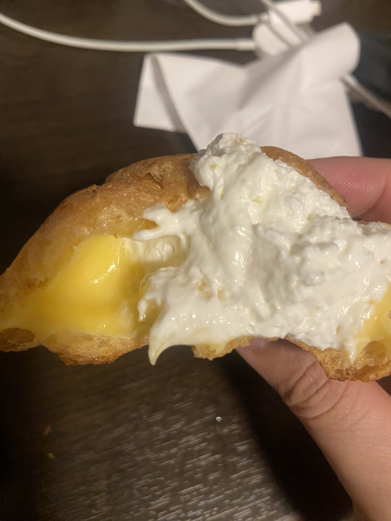 숙소에 돌아와 먼저 짐을 정리했다. 거의 일주일을 머무니 캐리어네 마냥 놔둘 수는 없으니 말이다. 그런 후, 지친 몸을 따뜻한 물줄기 아래서 녹였다. 샤워를 마치고는 사온 디저트를 꺼내든다. 먼저 푸딩을 뜯었다. 푸딩은 탱글탱글보다는 크림처럼 부들부들했다. 진한 바닐라와 적당한 단맛이 좋았다. 그러고 나니 옆에 덩그러니 놓인 슈가 아쉬워서 슈를 뜯었다. 당연히 슈는 바삭할 수는 없다. 부드럽고 얇은 왕 큰 슈에 커스터드 크림과 생크림 같은 하얀 크림이 함께 있었다. 야무지게 슈까지 먹고 나니, 아까 배부르던 게 맞나 싶었다.