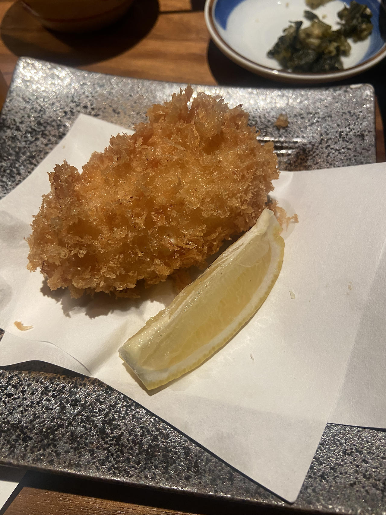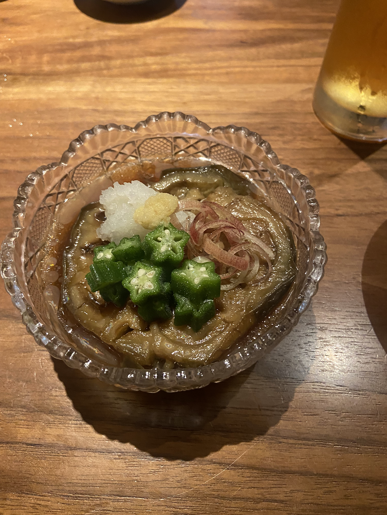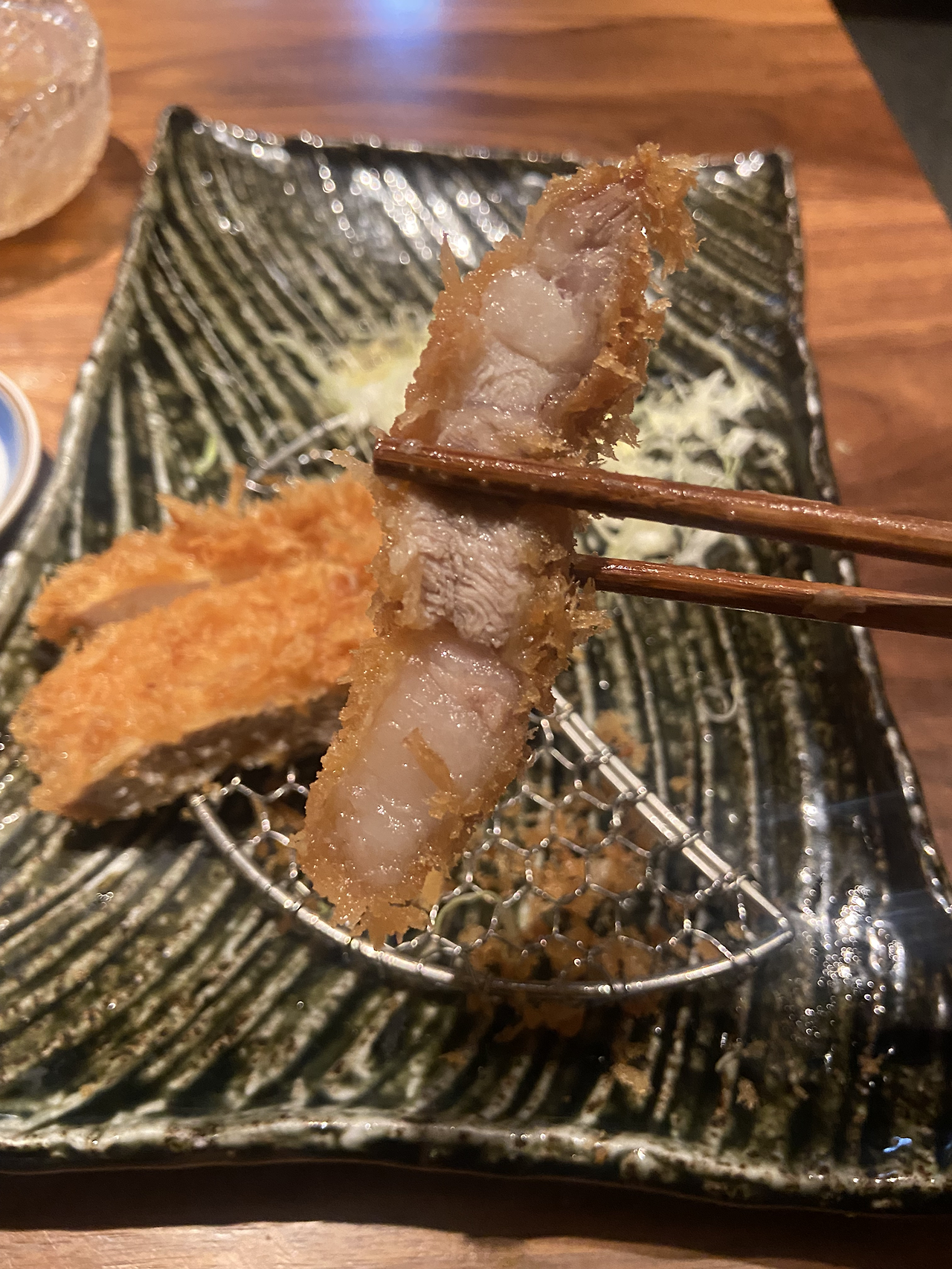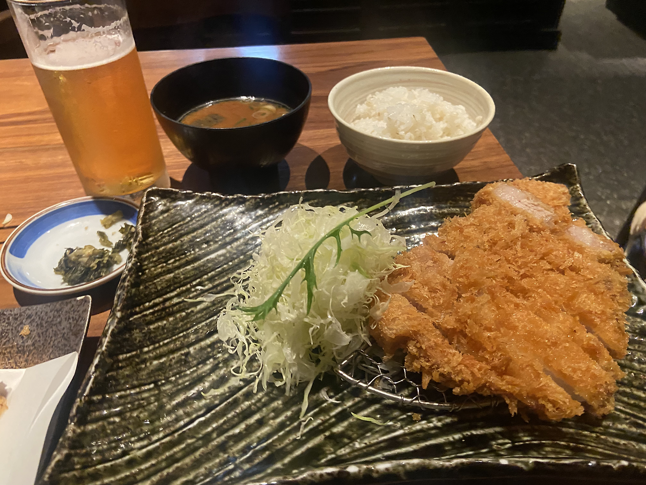 먼저 시원한 맥주가 나왔다. 한 모금 마시니 시원하고 개운했다. 잠시 후, 가지요리가 나왔다. 아주 커다란 가지를 쯔유 같은 양념에 담가두고 위에는 오크라가 잘라있었다. 교토에 도착할 때쯤부터 있던 두통이 조금씩 심해지고 있어서, 시원하고 가벼운 채소요리가 입맛을 돋워주었다. 가지는 부드럽게 잘 익어있었고, 소스의 감칠맛이 좋았다. 그렇게 가지를 먹은 뒤, 게살크림크로켓 와 돈가스가 나왔다. 게살크림을 갈라보니 아주 크리미 한 게살이었는데 내게는 너무 느끼한 느낌이었고, 피곤함에 이런 묵직한 느끼함이 당기지 않았다. 맛이 없다기보다는 내 컨디션에 맞지 않아 한 입 먹고는 남겨버렸다.