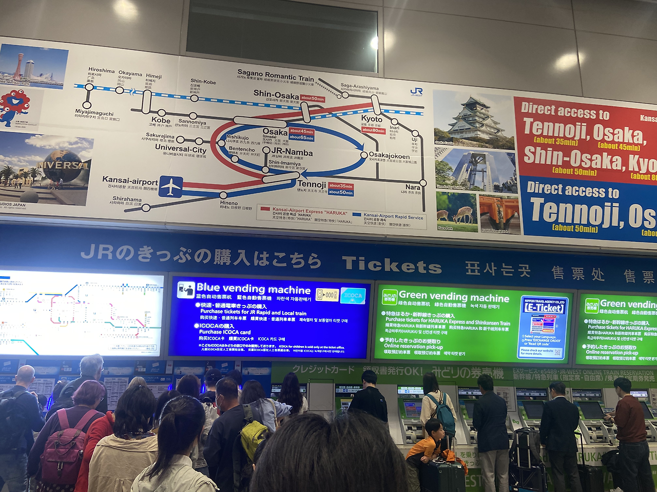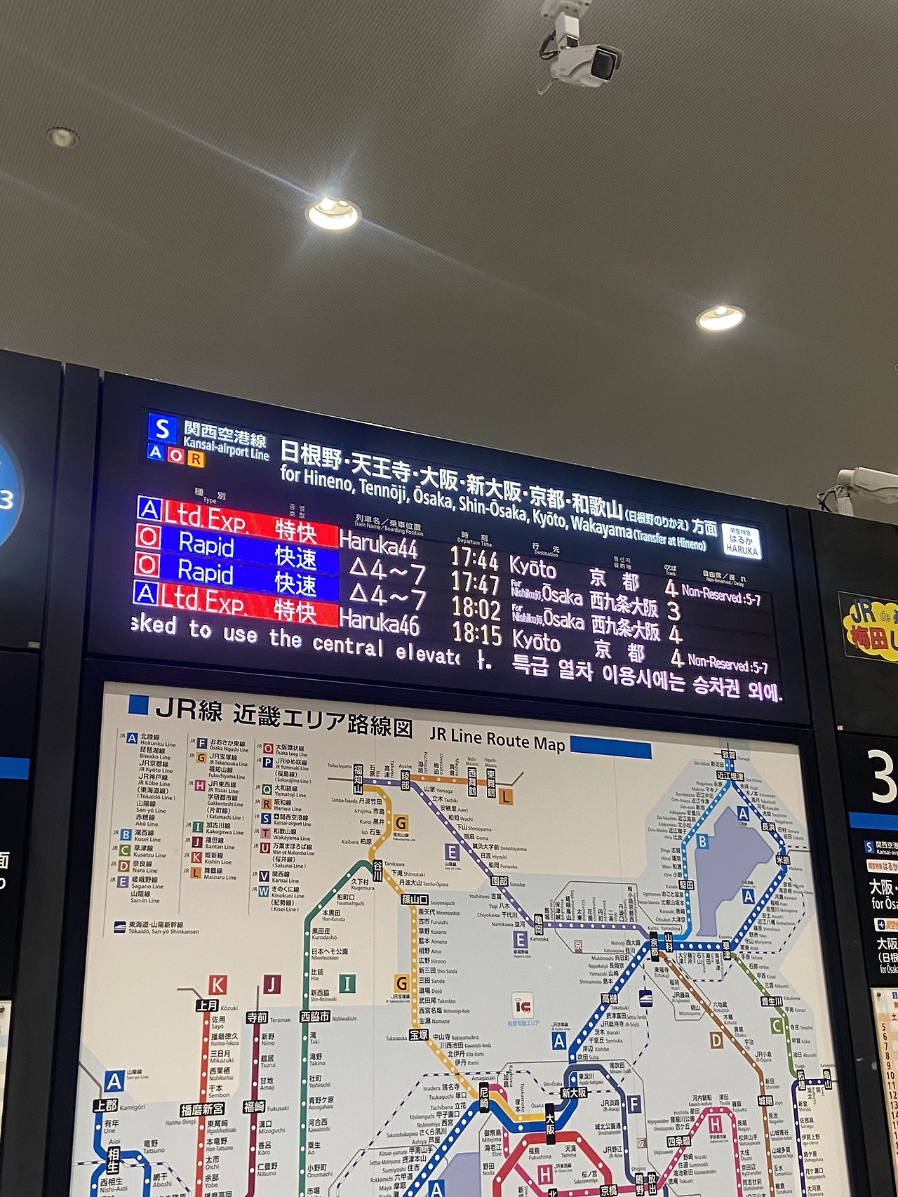공항에서 교토로 가는 열차를 미리 예매해 두었다. 그게 빠르고, 더 저렴하다고 인터넷에서 봐서 한 선택이었는데 전혀 빠르지 않게 되어버렸다. ICOCA 교통카드를 구매하려고 줄을 서서 20분 정도 기다렸는데, 내 순서가 다가올 때쯤, 기계 고장으로 다른 곳에 줄을 서라고 했다. 최소 10분이 더 필요하다면서 말이다. 다른 곳으로 다시 줄을 서서 기다렸다. ICOCA 카드는 외국인만 구매가능했고, 현금으로 결제를 해야 했다. 카드만 2000엔인데, 어차피 나중에 남은 건 다시 뺄 수 있으니 넉넉히 충전한다고 5000엔 지폐 한 장을 넣었다. 그런 후, 이제 인터넷으로 미리 예매한 하루카열차 티켓 교환을 위한 줄을 다시 섰다. 줄을 서서는 예매 QR로 하루카 티켓을 출력했다. 그런 후, 티켓을 들고 게이트로 가려했는데 티켓을 보니 자리를 예약하라는 문구가 쓰여있더라. 문득 하루카티켓 머신에서 자리 예약 버튼을 봤던 것 같다. 다시 줄을 선다. 자리를 예약한다. 시계를 본다. 한 시간이 지났다. 3시 40분에 간사이 공항에 착륙했는데, 5시 44분 하루카열차에 탑승했다. 점점 피로감이 몰려왔다.